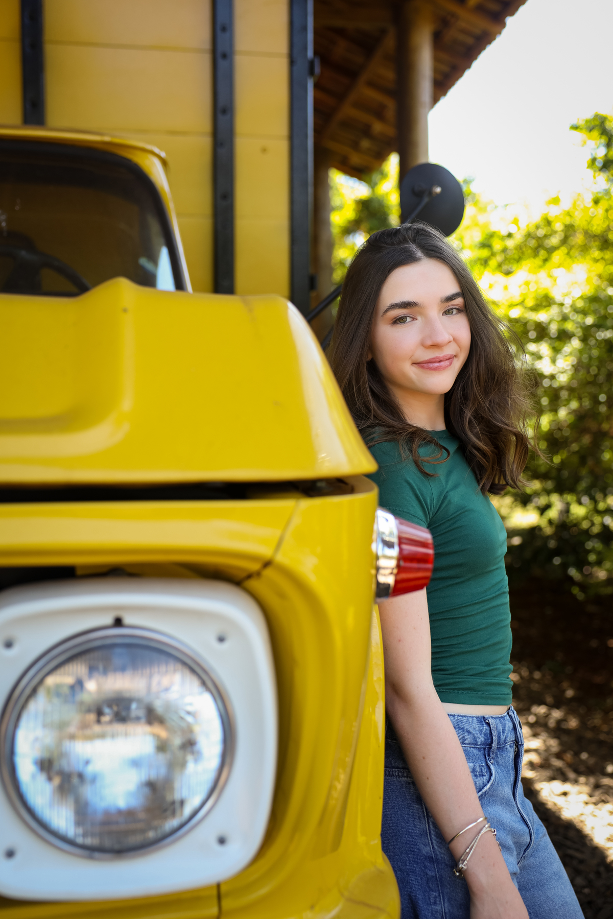 Fotografamos junto à plantação de cana-de-açúcar, onde a luz natural e o verde intenso compuseram imagens únicas. E não poderíamos deixar de registrar a Letícia ao lado de um verdadeiro símbolo da família: o primeiro caminhão comprado por seu avô. Um modelo clássico, robusto, com carroceria de madeira e detalhes que contam histórias de uma vida inteira dedicada à terra.