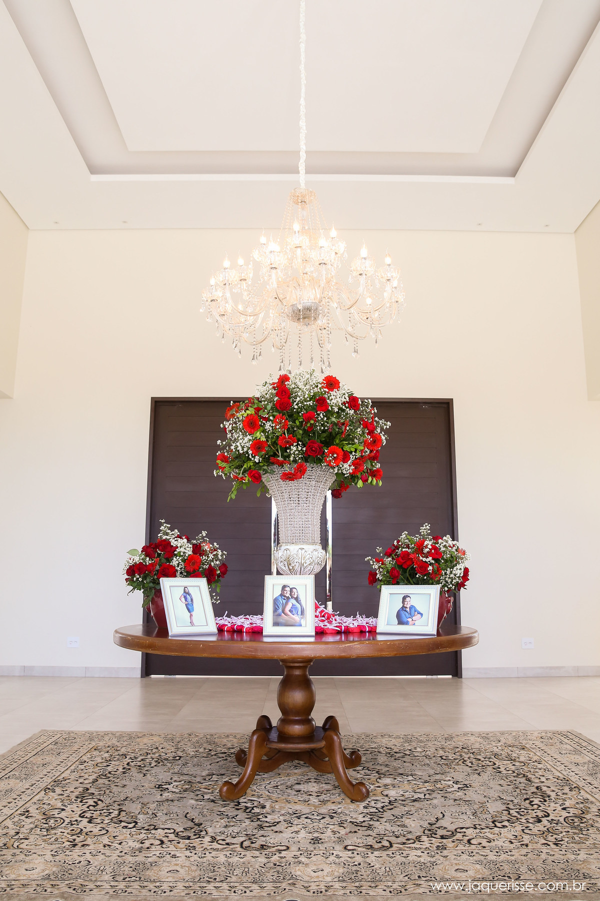 vestido pendurado no cabide na parede do salão de beleza com os sapatos e o bouquet sobre uma mesinha no click da fotógrafa de casamento Bebedouro SP Jaque Risse