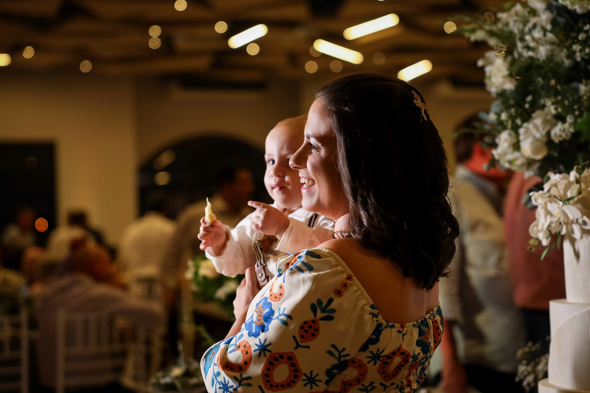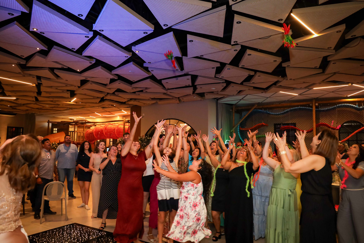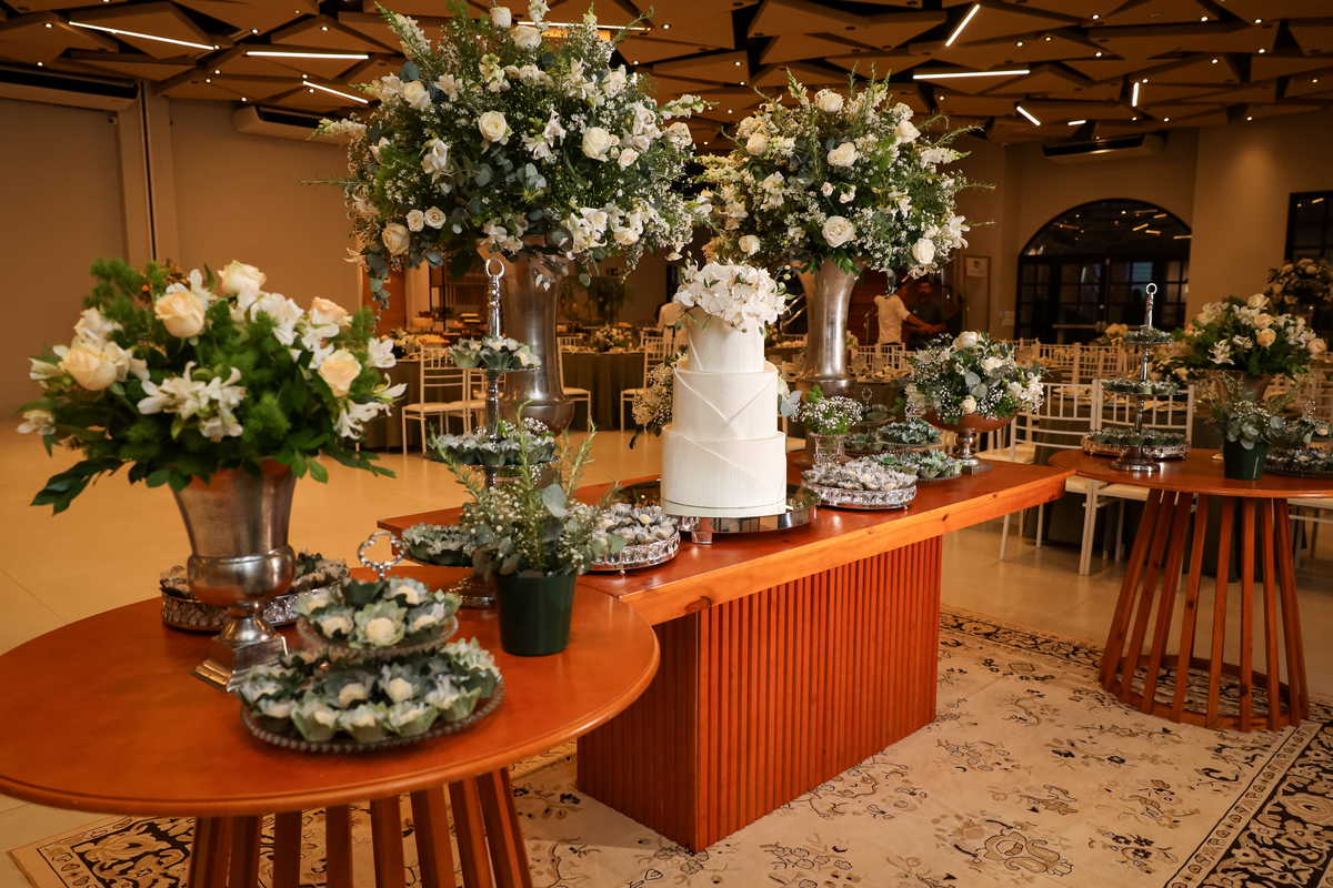 Após as bênçãos, a festa começou com um ambiente cuidadosamente decorado para a ocasião, trazendo sofisticação e aconchego. Os tons de verde-esmeralda, simbolizando a longevidade e a preciosidade do amor, estavam presentes nos detalhes da decoração, tornando o espaço ainda mais especial.