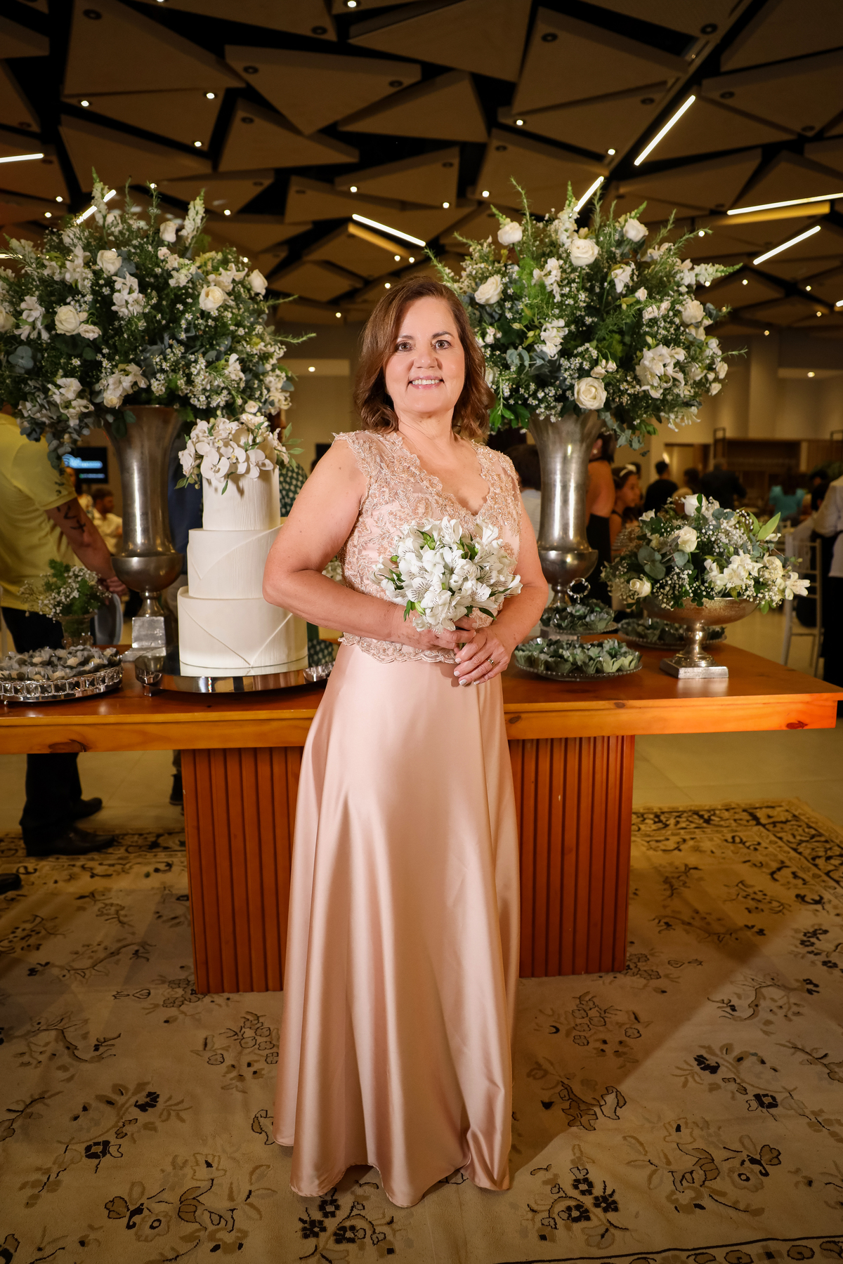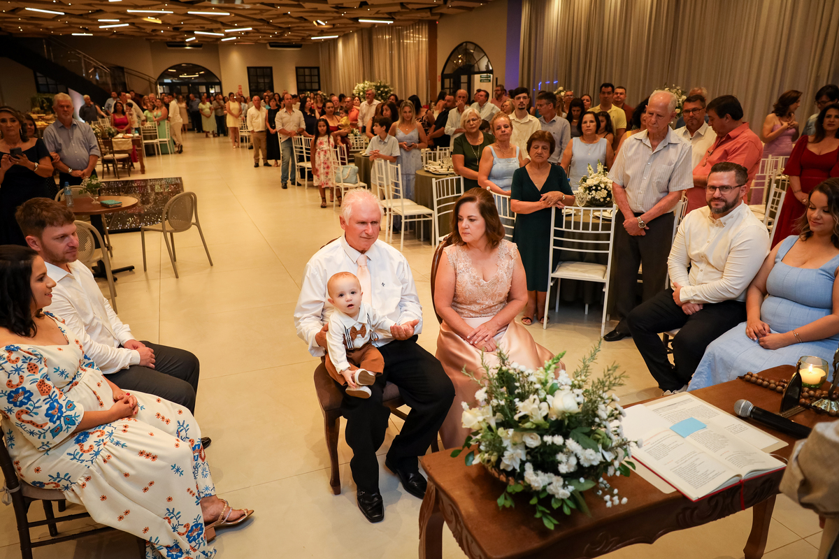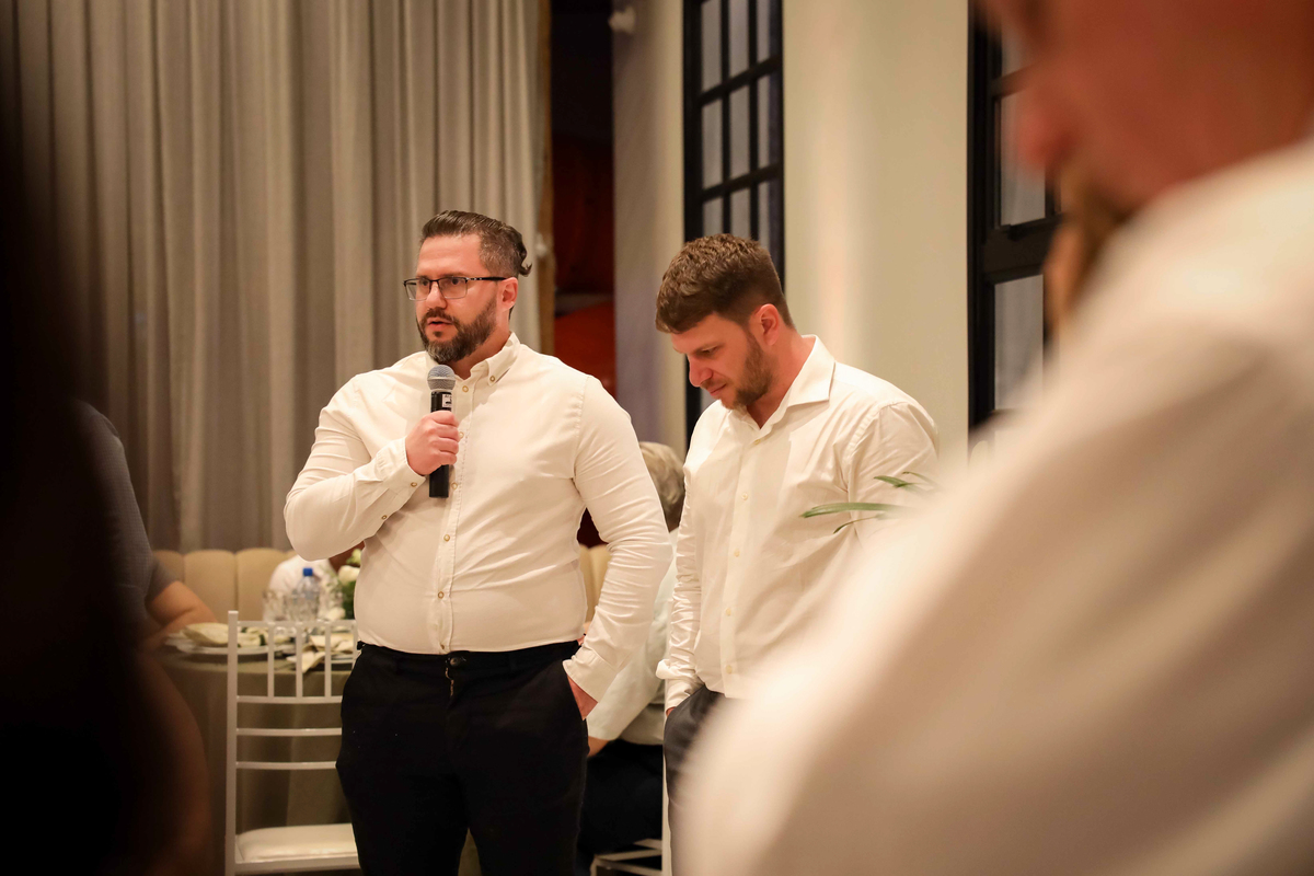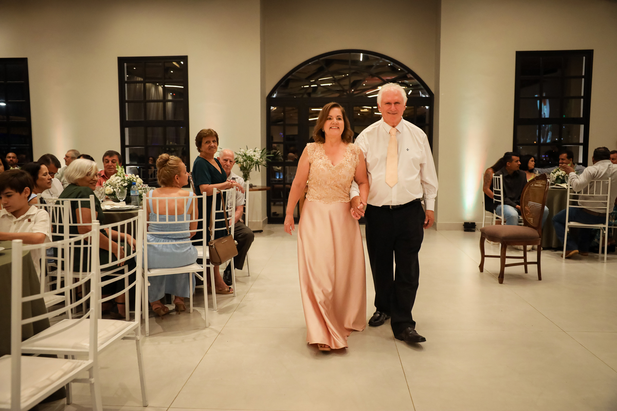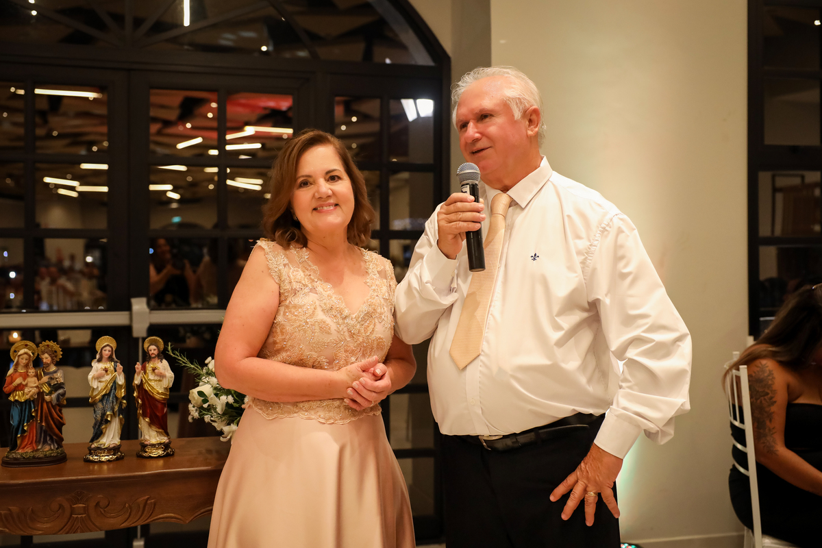 Desde o primeiro instante, os convidados foram recebidos com carinho pelo casal, que fez questão de cumprimentar cada um na entrada. Esse momento de acolhimento já dava o tom da noite: uma celebração cheia de emoção e significado.