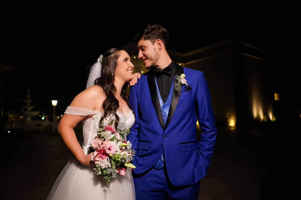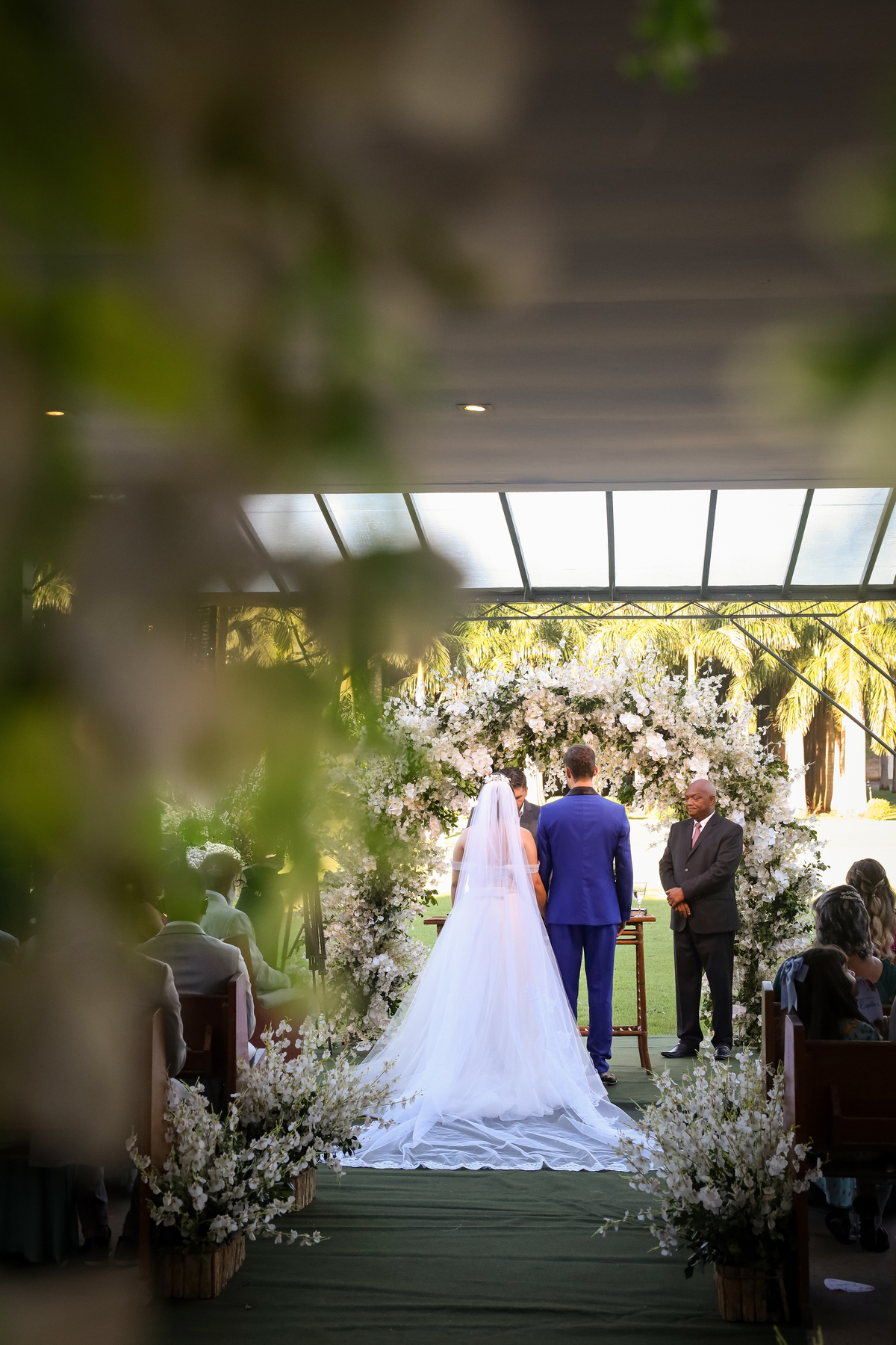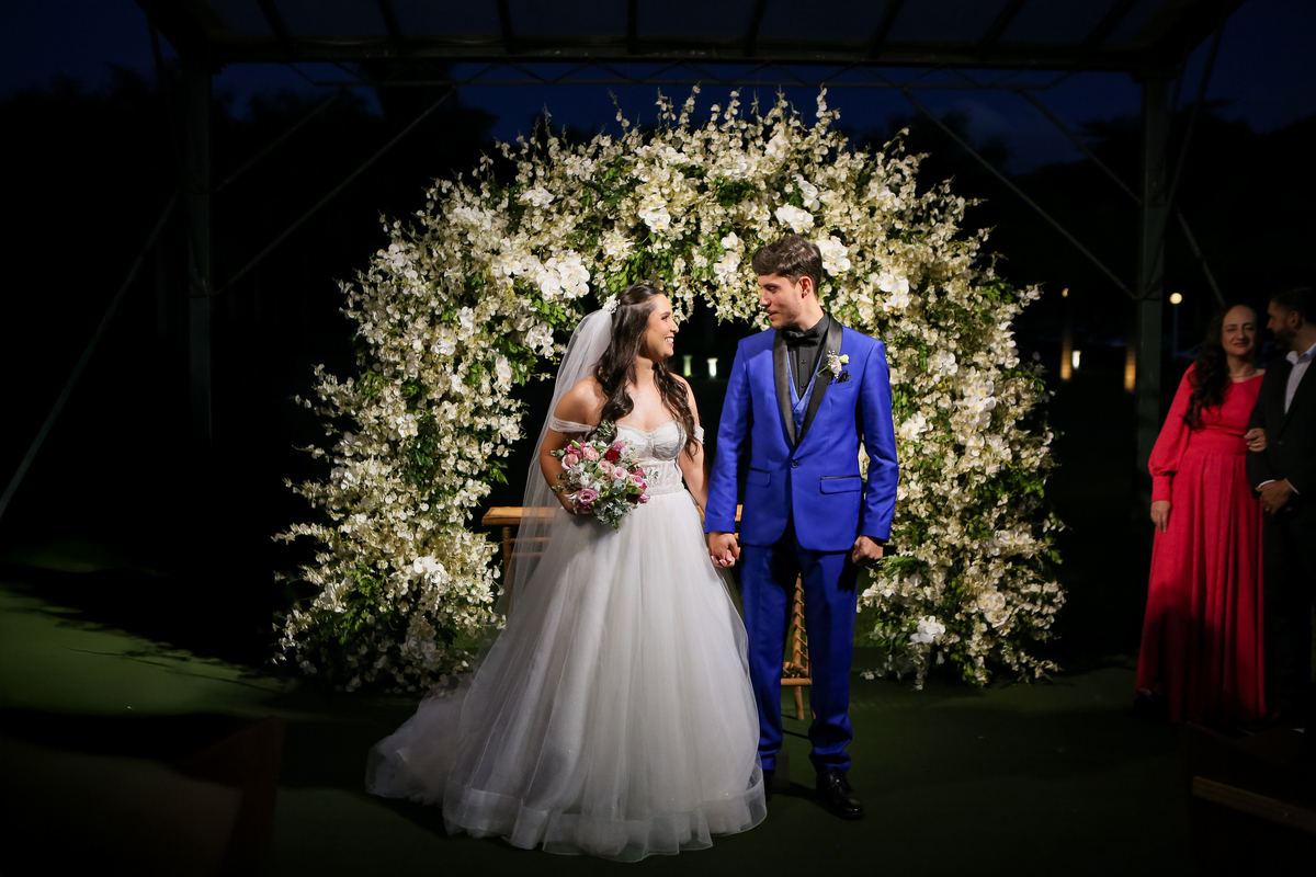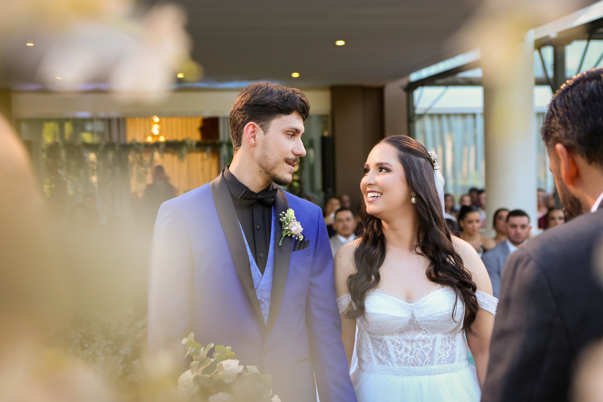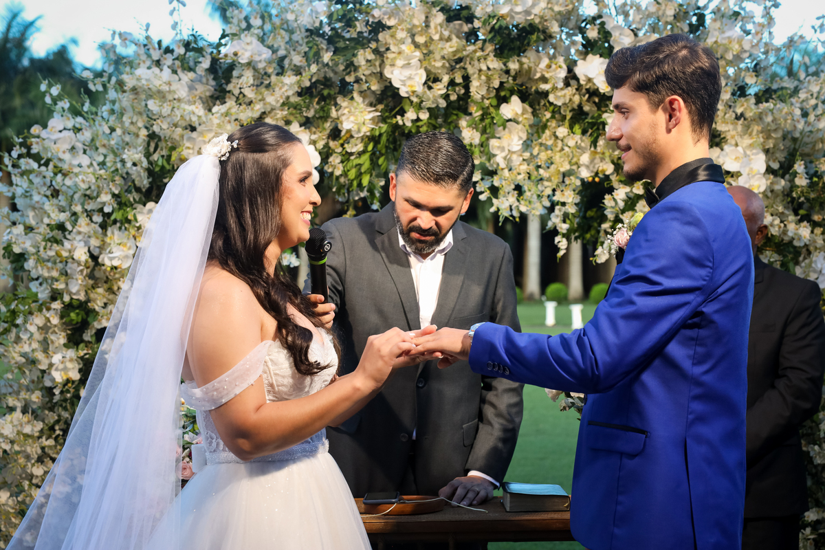 O amor da Emilly e do Gabriel foi celebrado em grande estilo em Bebedouro – SP, em um casamento cheio de emoção, beleza e personalidade. A cerimônia ao ar livre, realizada no espaço externo do salão Villa Ecnny, foi um verdadeiro cenário de conto de fadas. O corredor central, ladeado por flores brancas, levava até um imponente arco floral no altar, onde o casal trocou seus votos em meio a olhares emocionados e sorrisos sinceros.