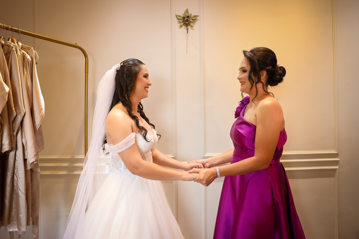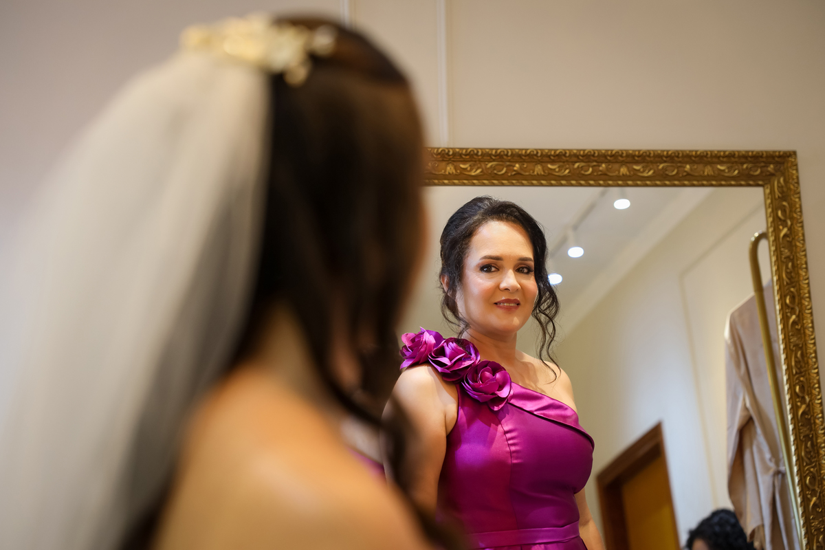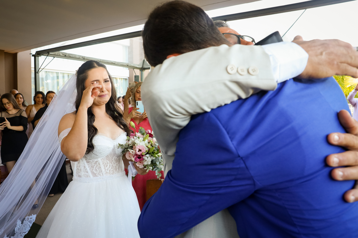 Logo após o “sim”, os convidados foram recebidos na parte interna do salão, onde a decoração ganhou um toque romântico com flores em tons rosados. Cada detalhe refletia o carinho e a delicadeza do casal, criando um ambiente acolhedor e sofisticado.
