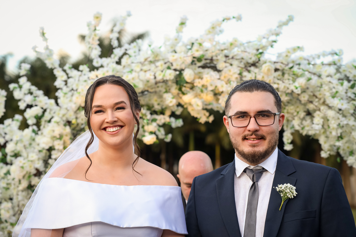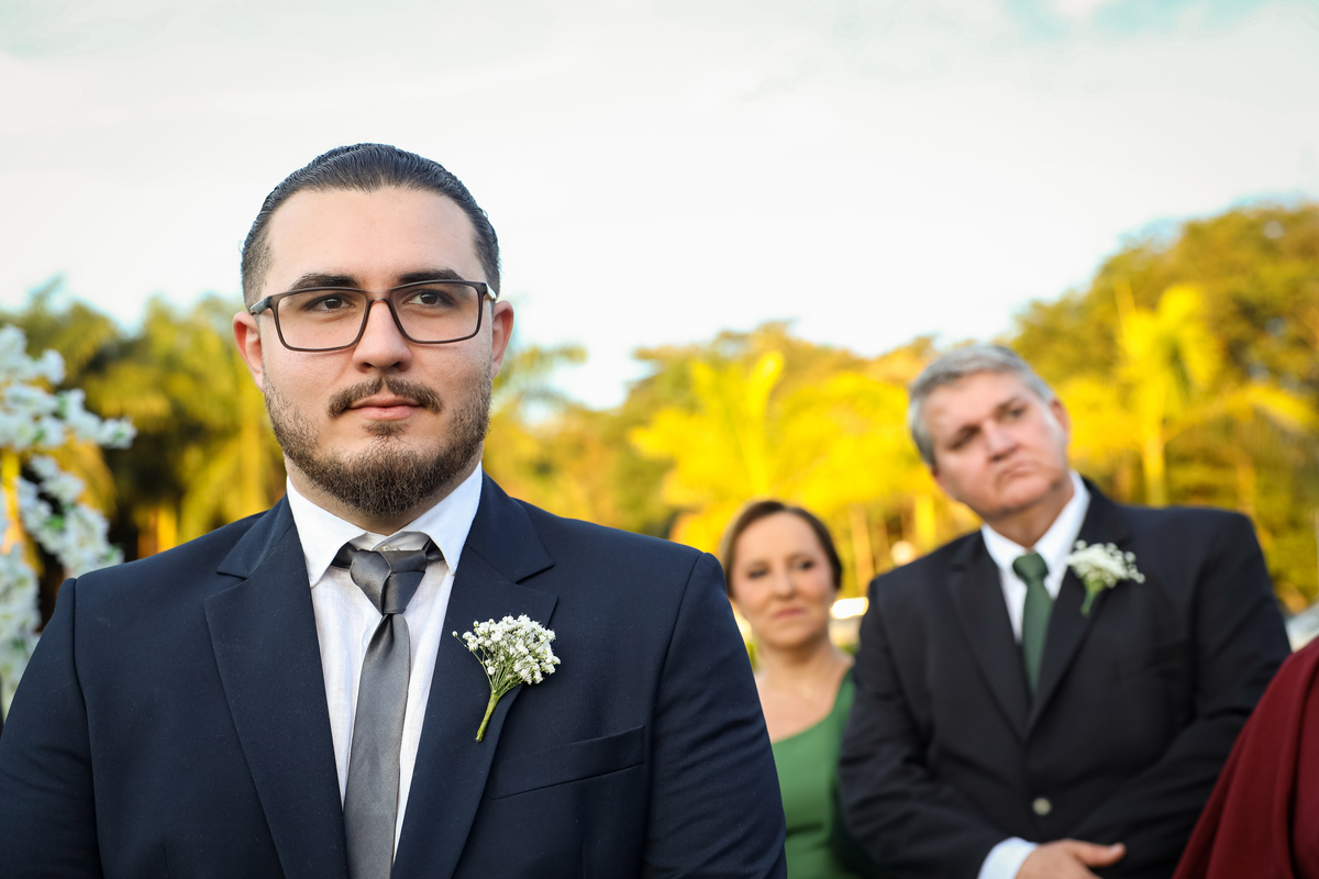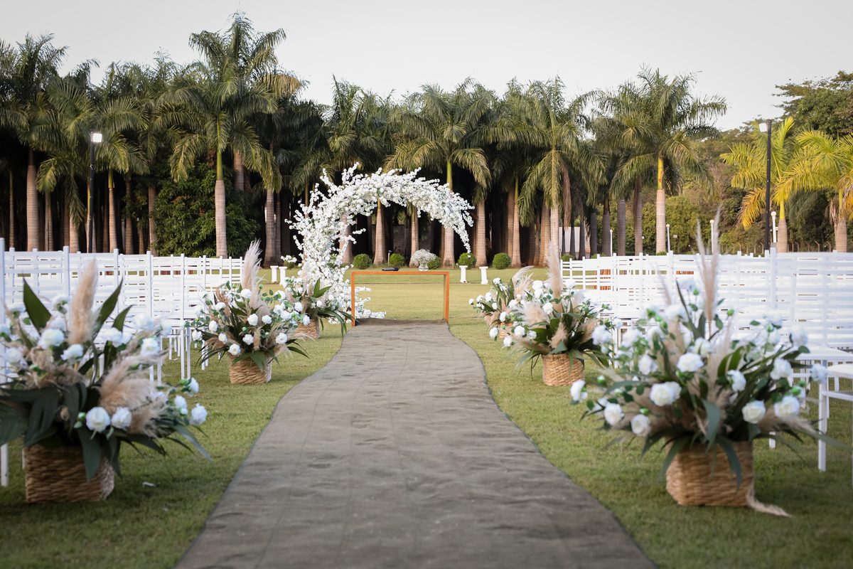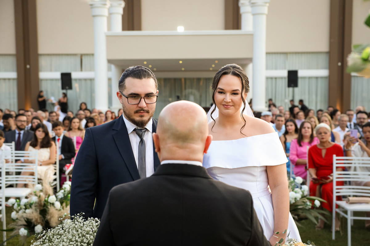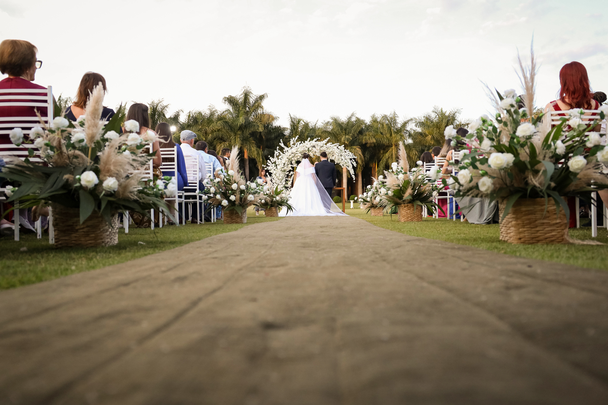 A cerimônia aconteceu na área externa do Salão Villa Eccny, bem no horário do pôr do sol, que deixou o ambiente ainda mais mágico. A decoração da cerimônia trouxe toda a delicadeza do branco e do verde, destacando-se um lindo semi-arco de flores brancas no altar, que serviu de moldura perfeita para o “sim” tão esperado.