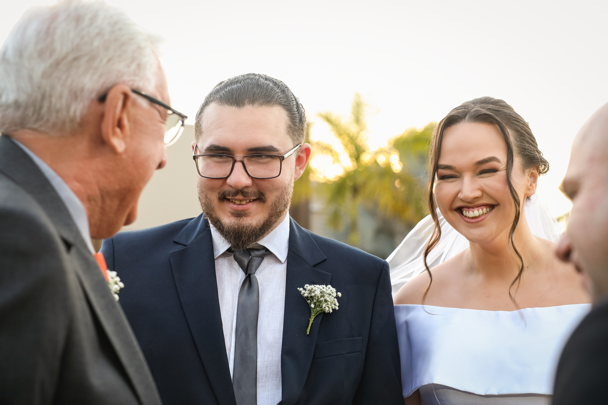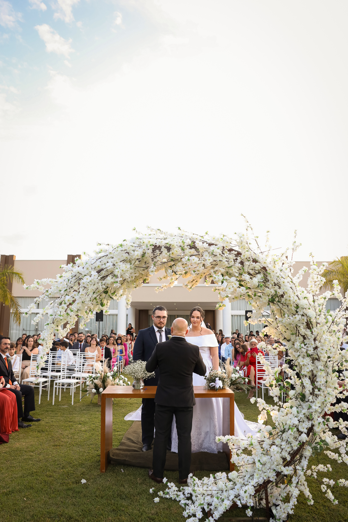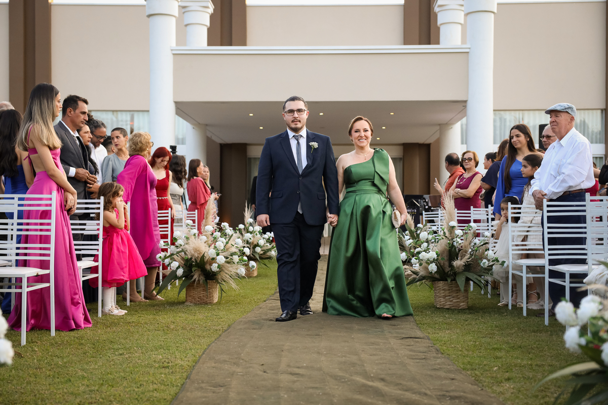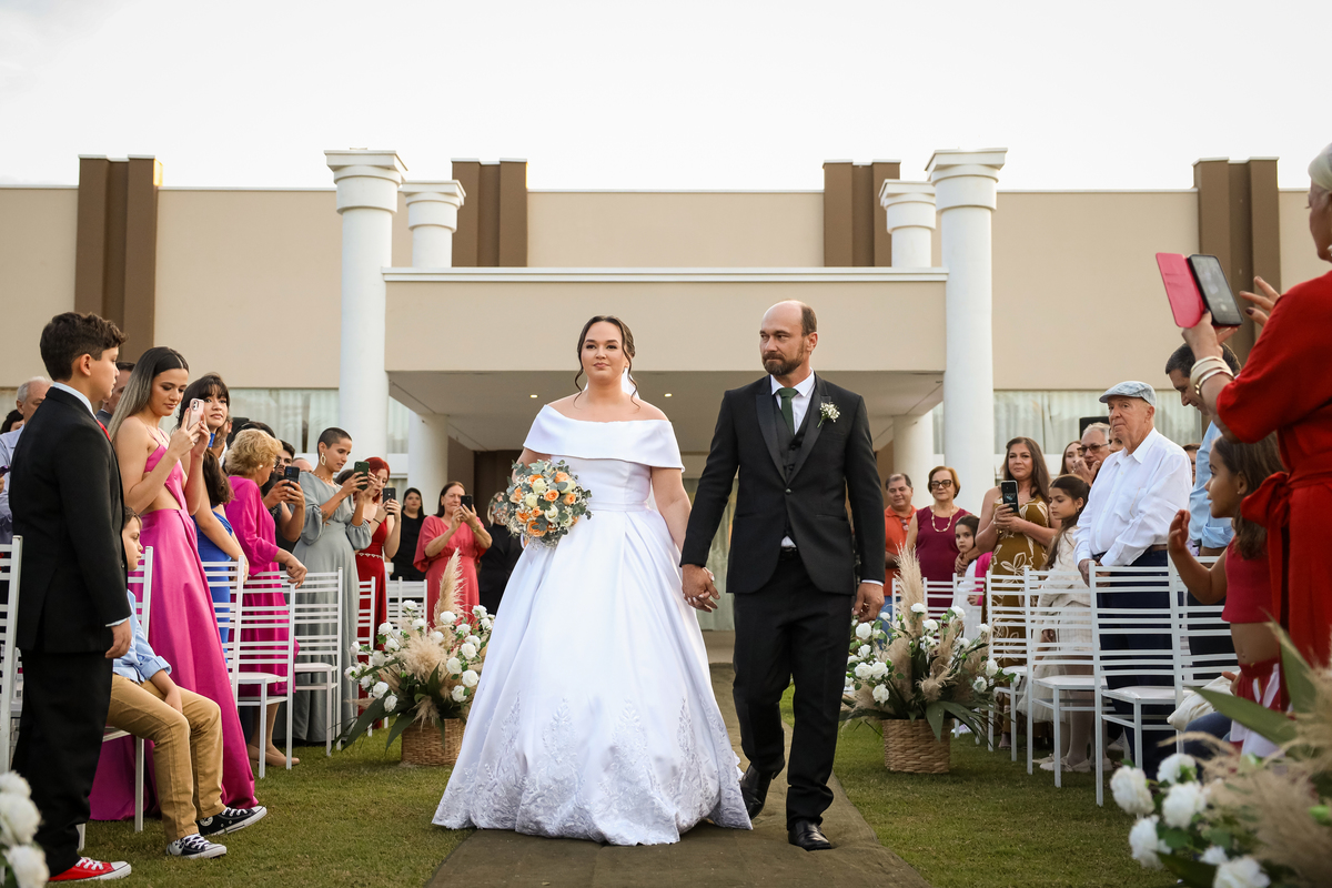 A cerimônia aconteceu na área externa do Salão Villa Eccny, bem no horário do pôr do sol, que deixou o ambiente ainda mais mágico. A decoração da cerimônia trouxe toda a delicadeza do branco e do verde, destacando-se um lindo semi-arco de flores brancas no altar, que serviu de moldura perfeita para o “sim” tão esperado.