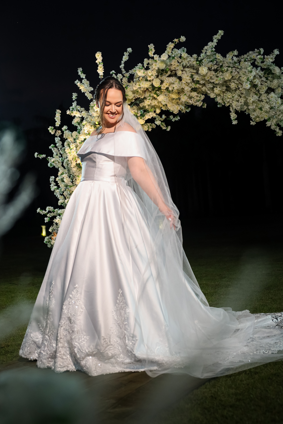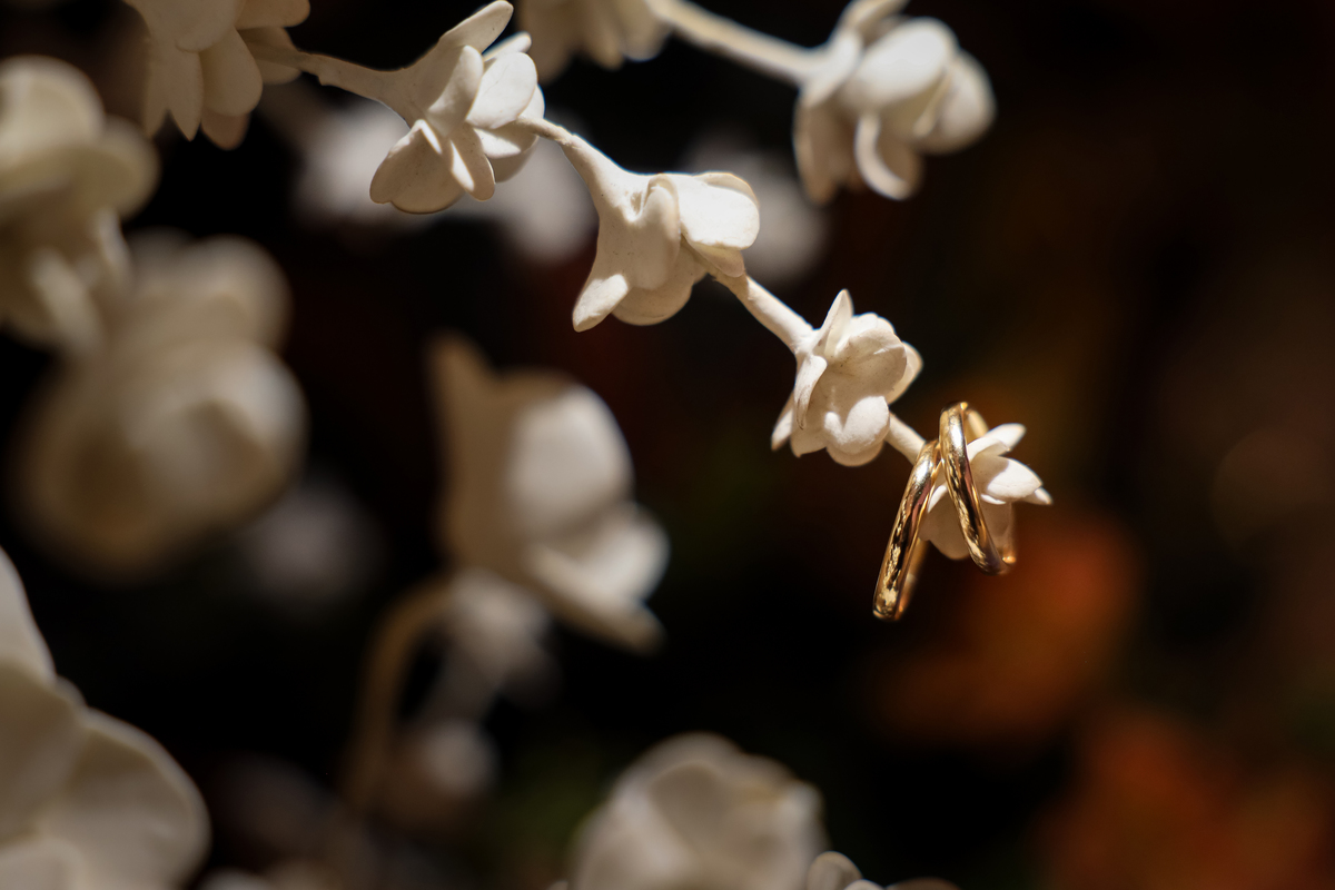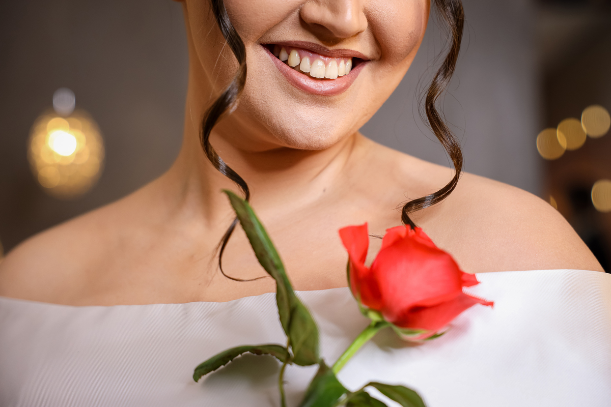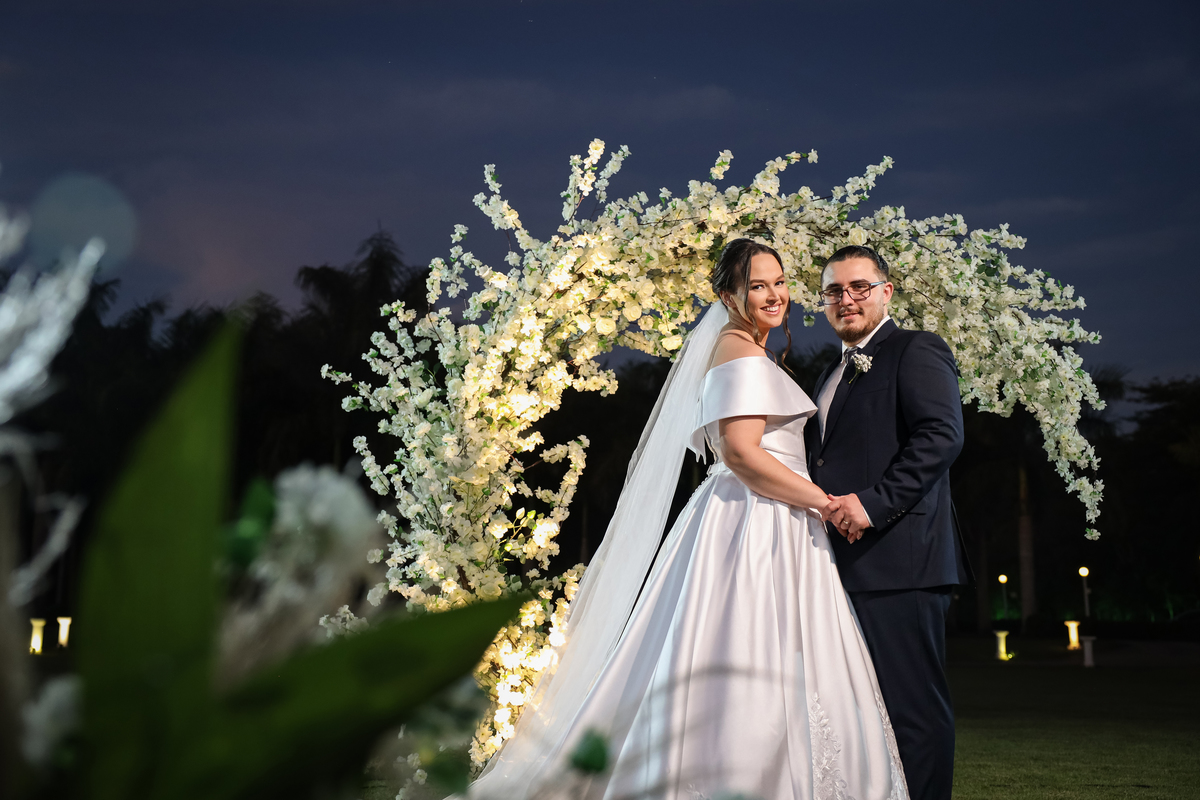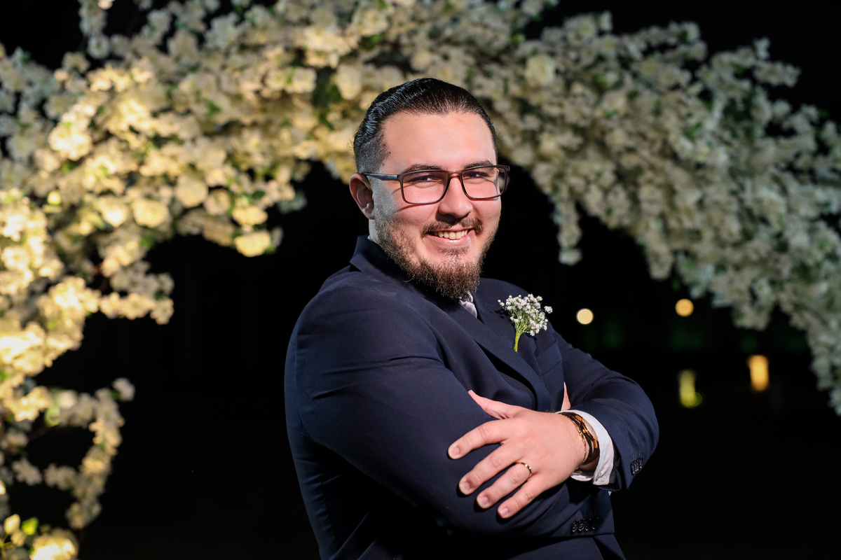 A cerimônia aconteceu na área externa do Salão Villa Eccny, bem no horário do pôr do sol, que deixou o ambiente ainda mais mágico. A decoração da cerimônia trouxe toda a delicadeza do branco e do verde, destacando-se um lindo semi-arco de flores brancas no altar, que serviu de moldura perfeita para o “sim” tão esperado.