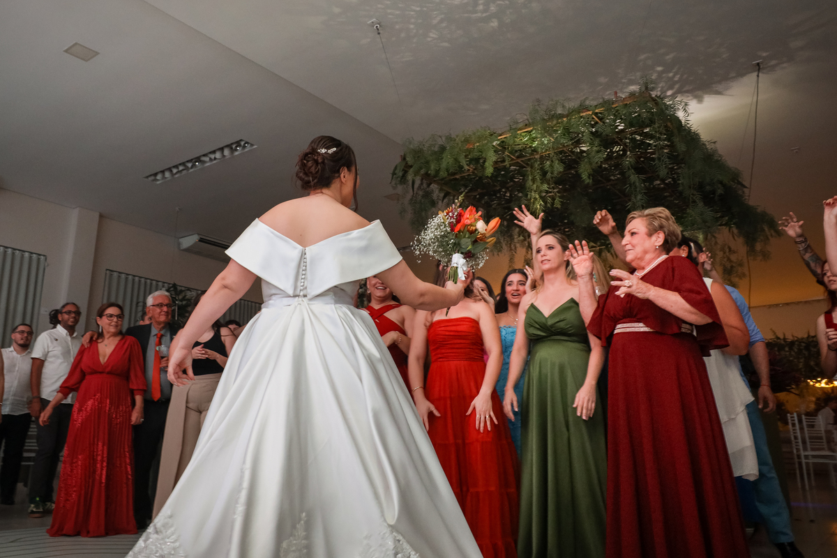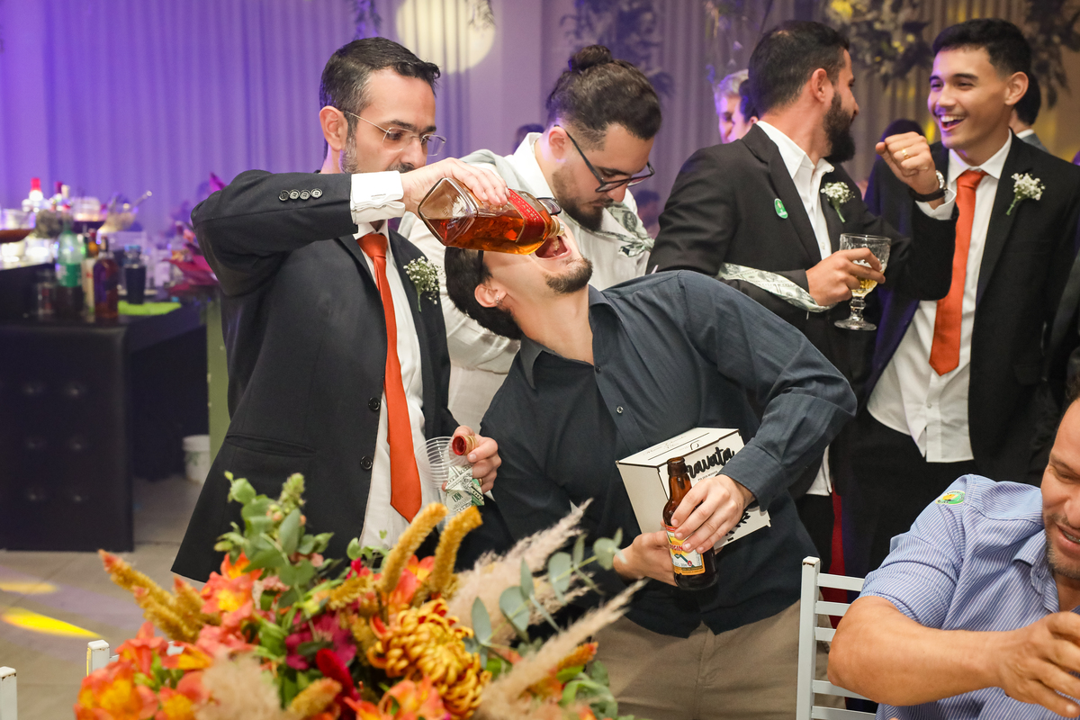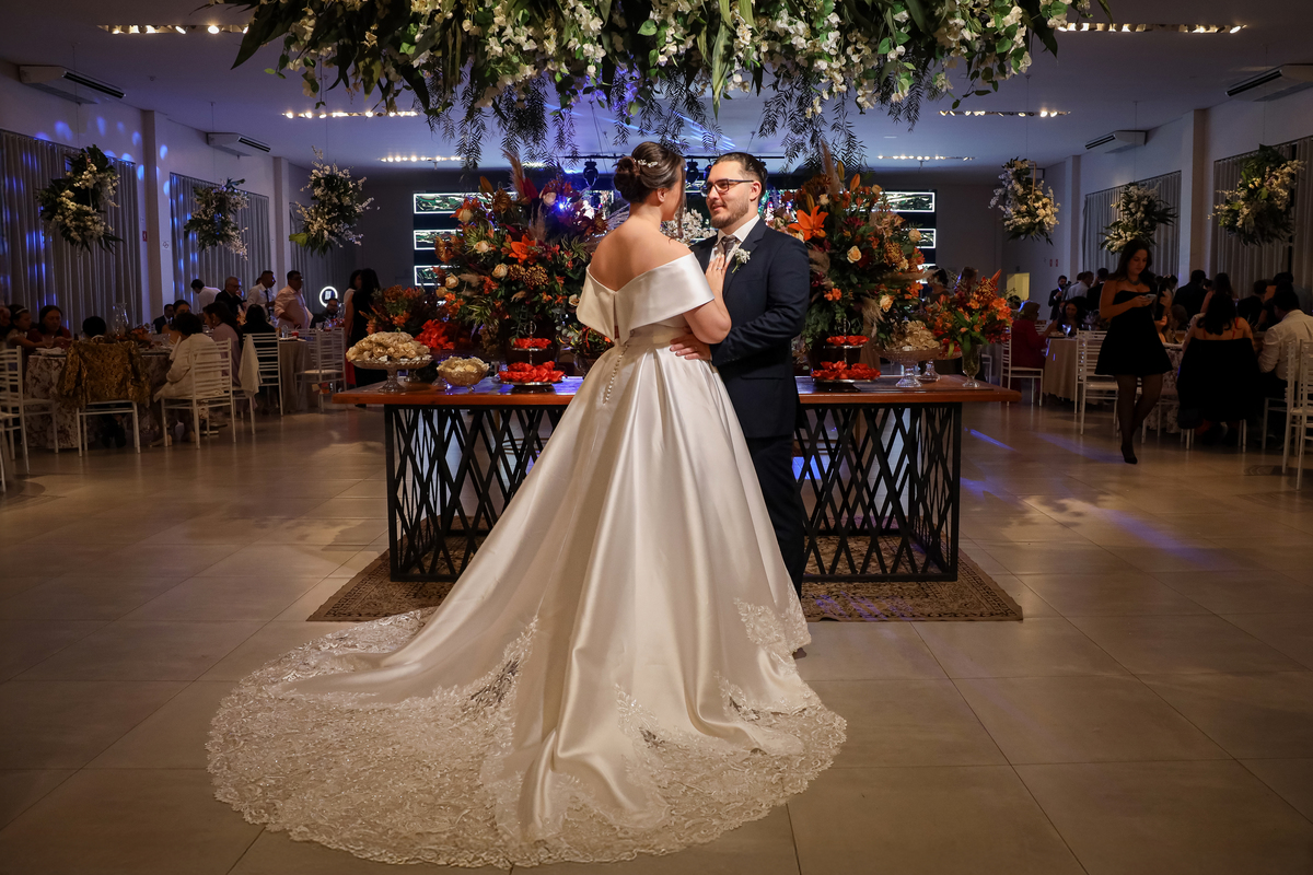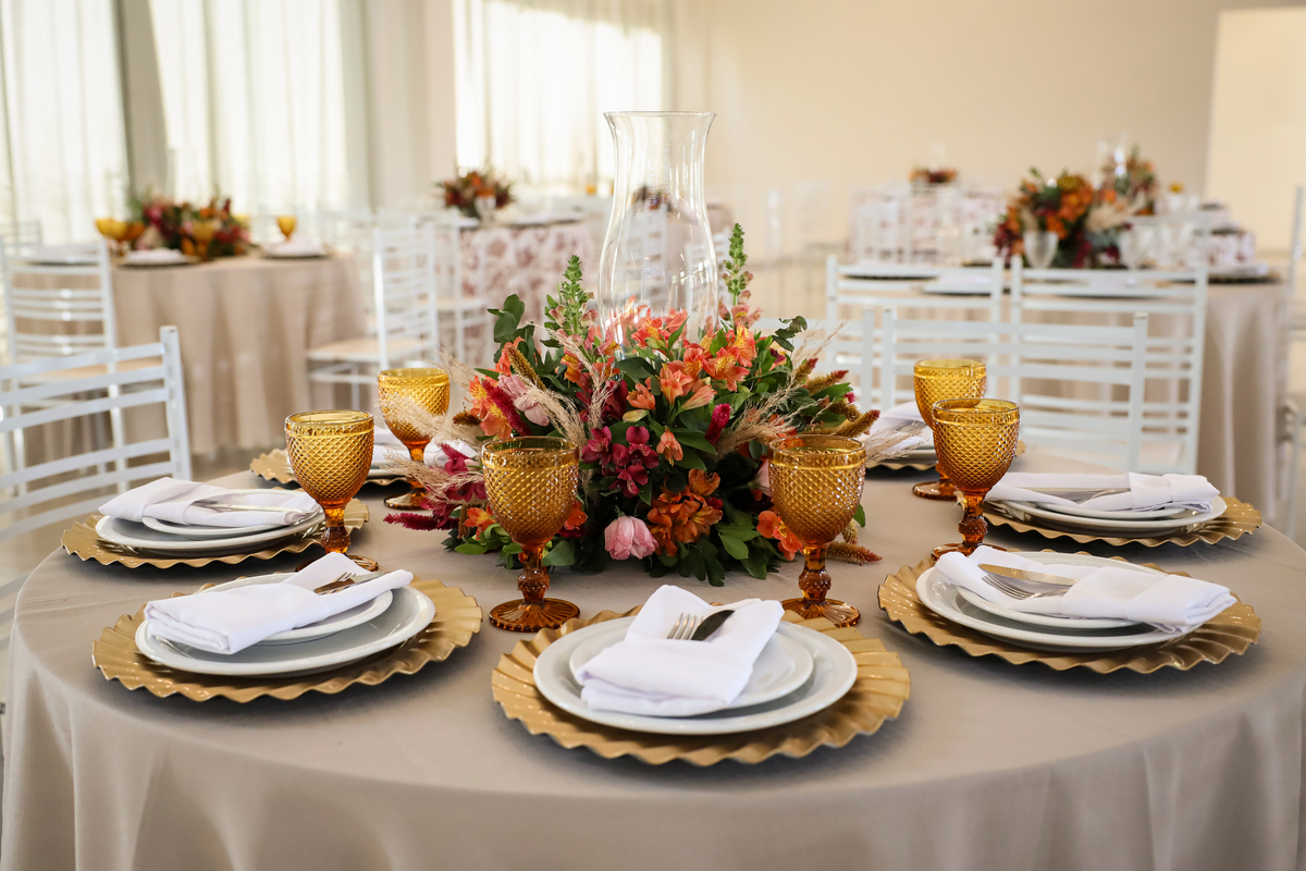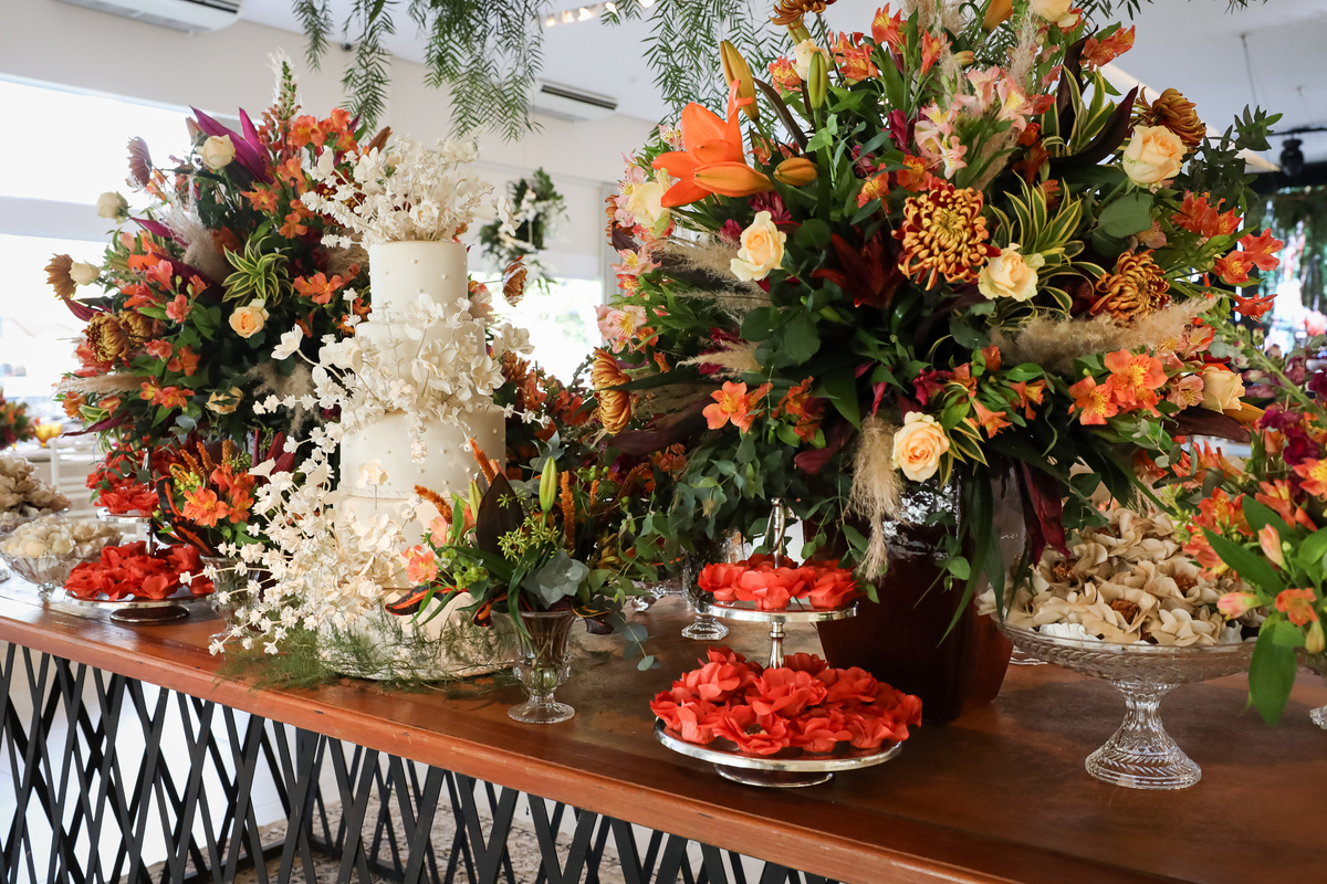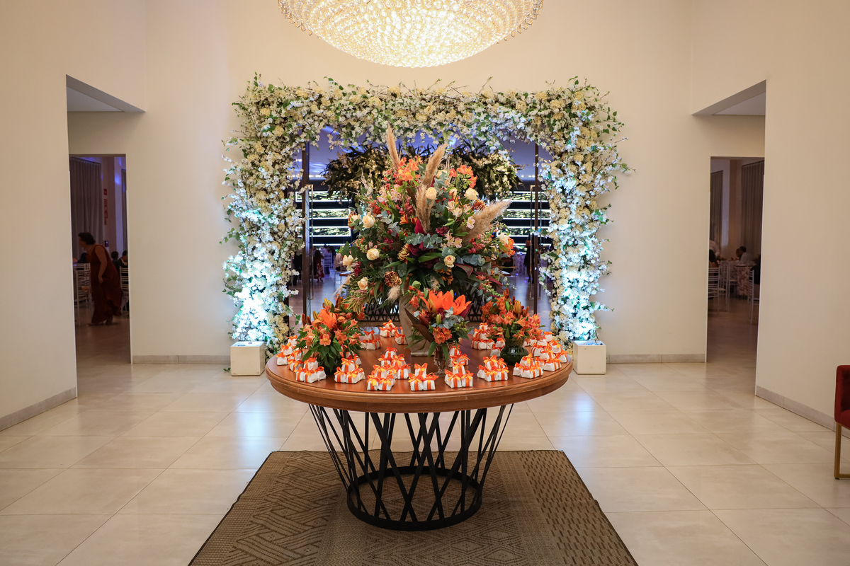Após a cerimônia emocionante, os convidados foram recepcionados na parte interna do salão, onde a decoração em tons de laranja trouxe aconchego, alegria e uma atmosfera vibrante para a noite.