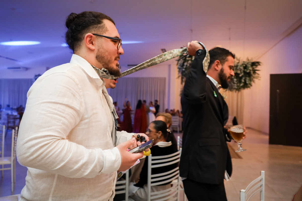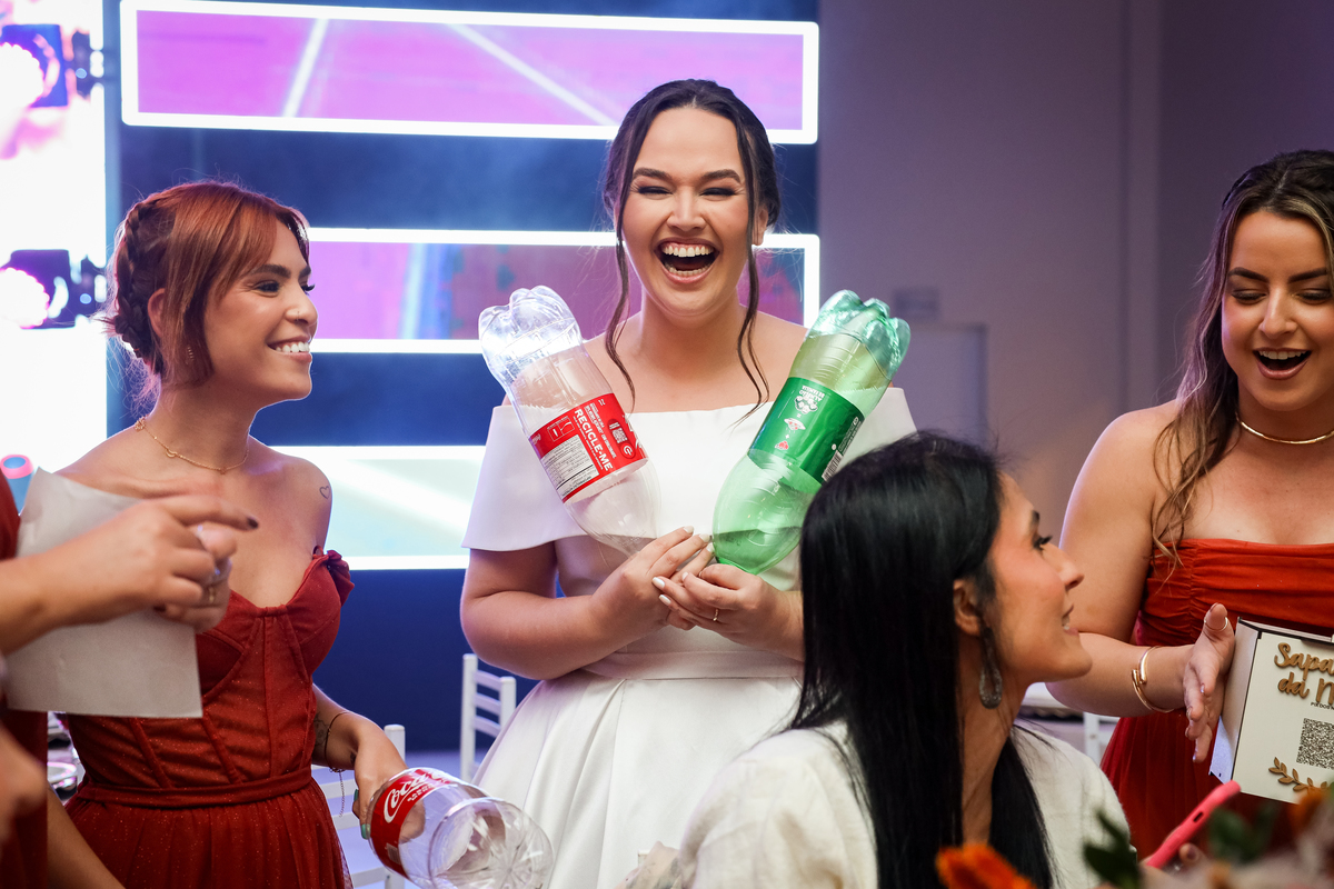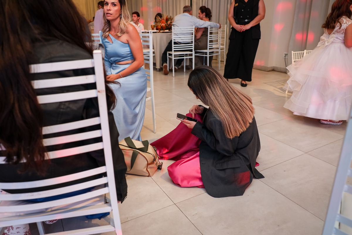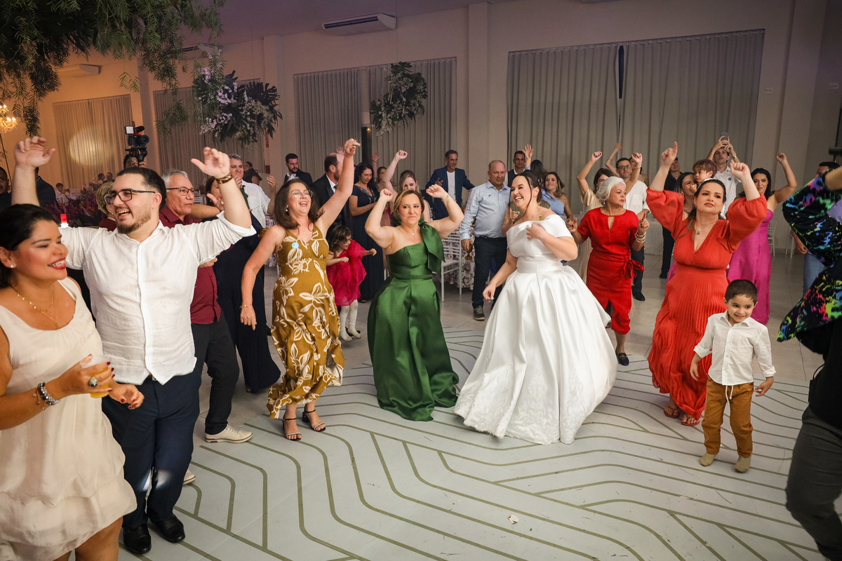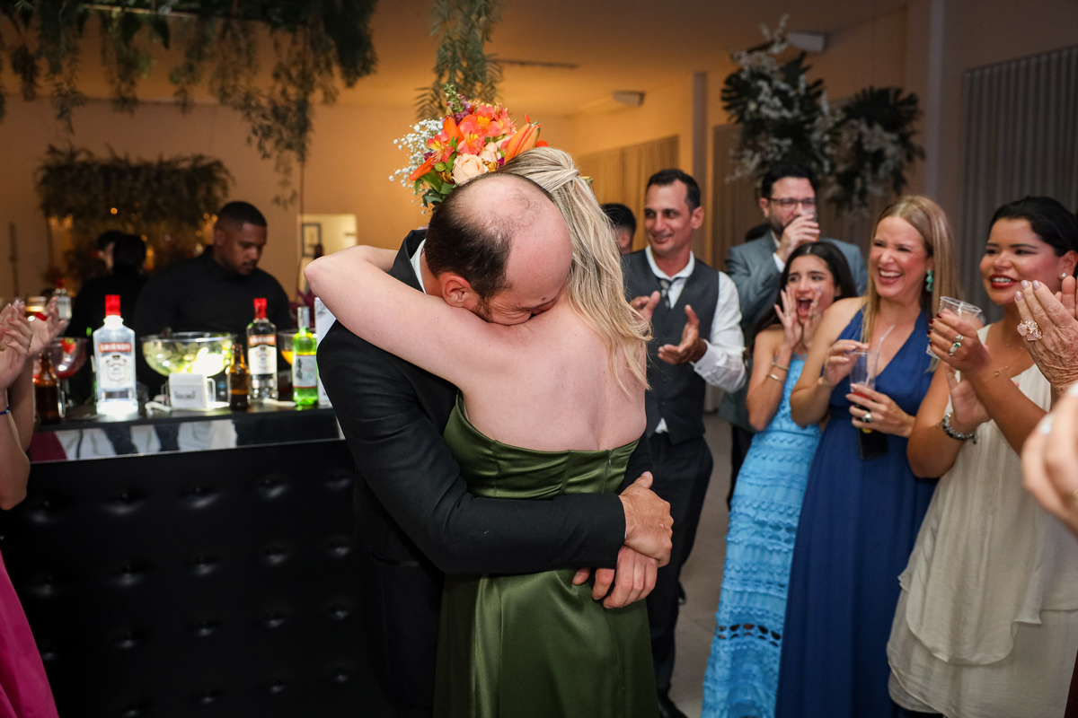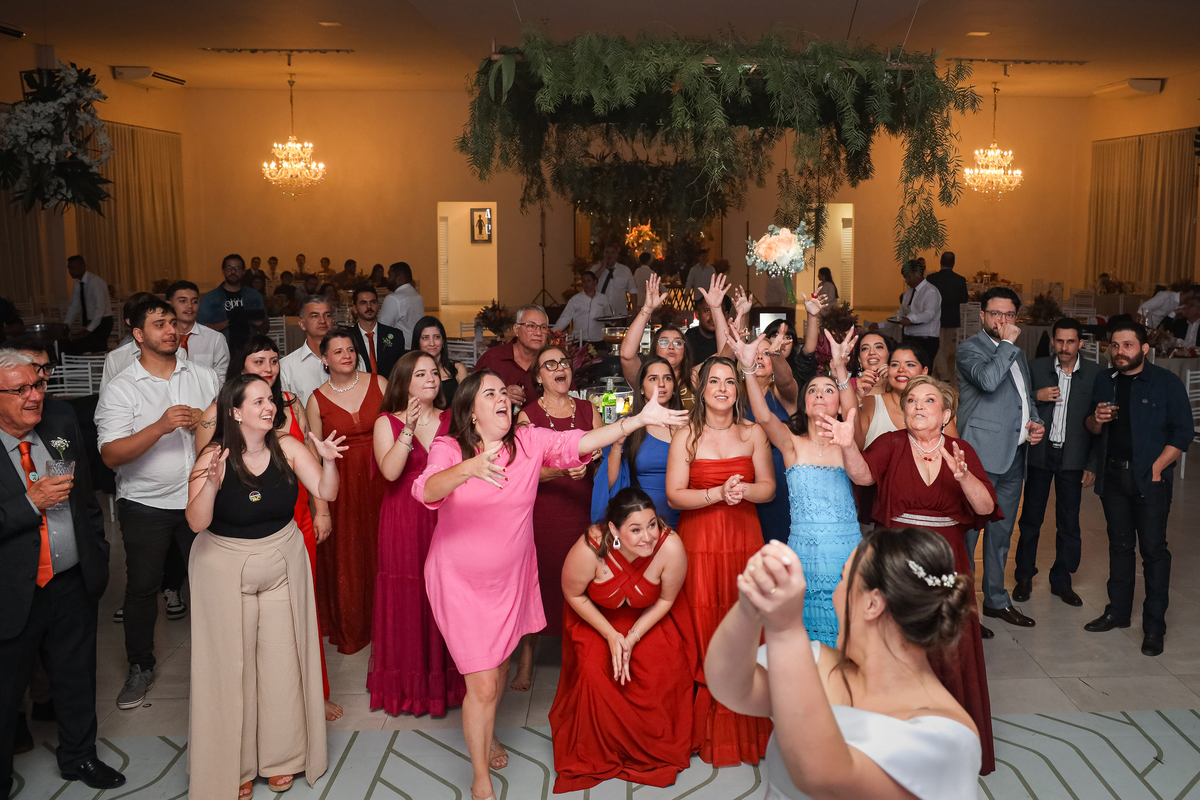 Após a cerimônia emocionante, os convidados foram recepcionados na parte interna do salão, onde a decoração em tons de laranja trouxe aconchego, alegria e uma atmosfera vibrante para a noite.