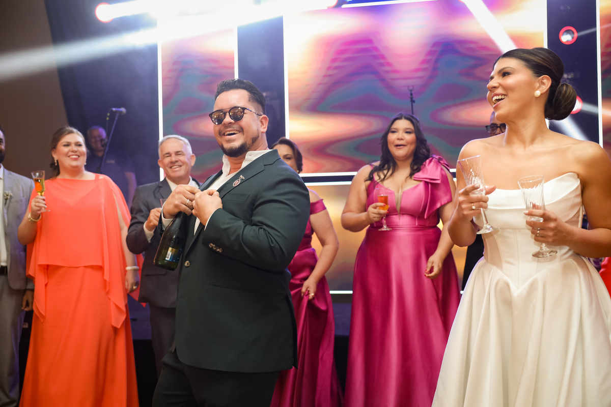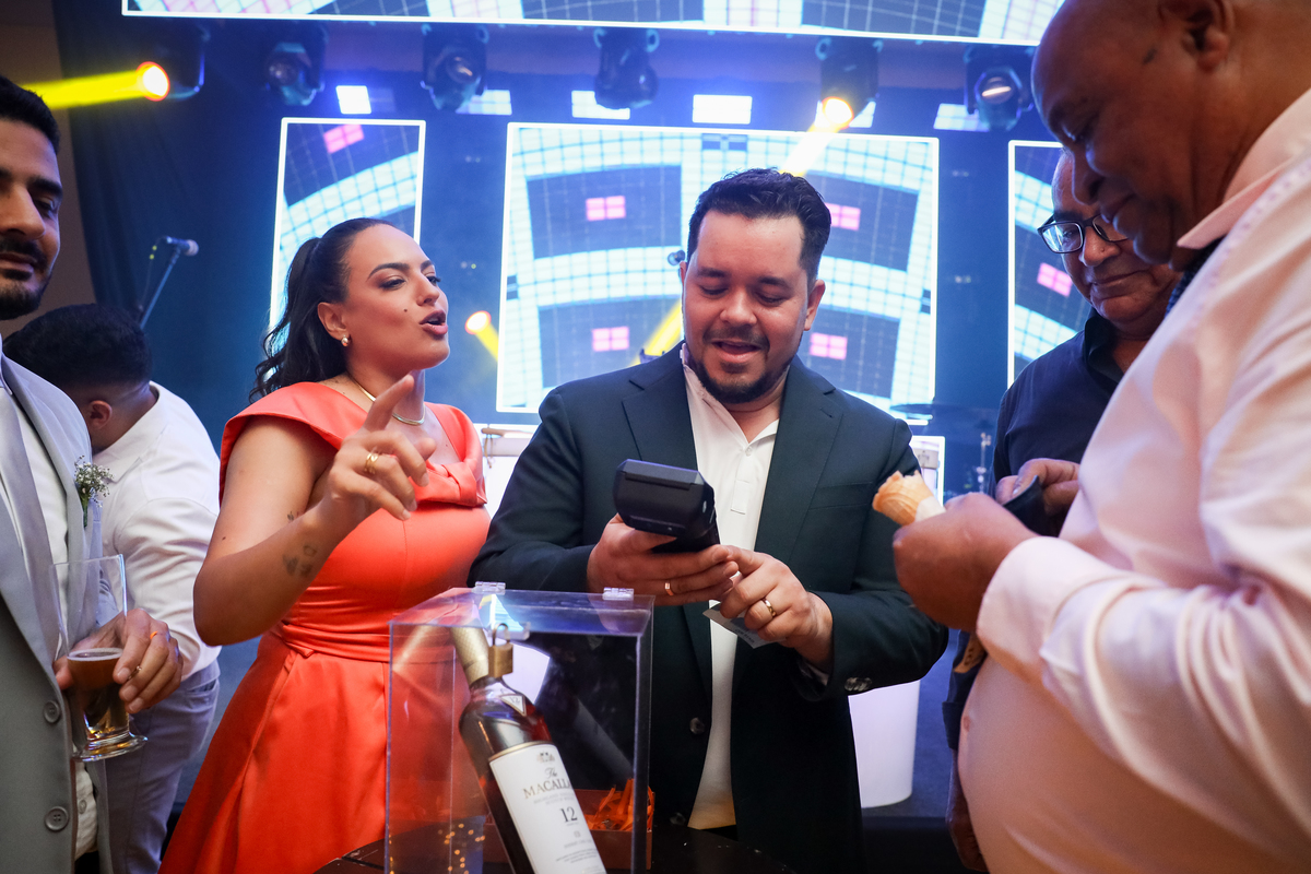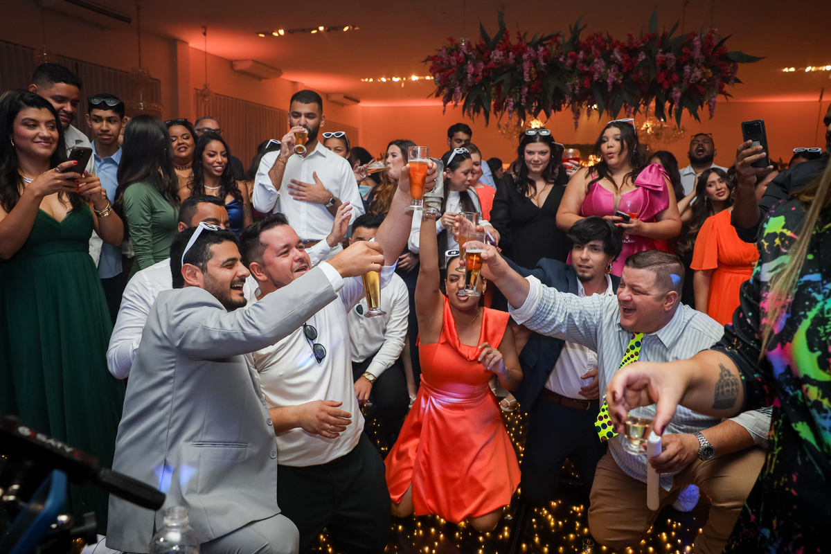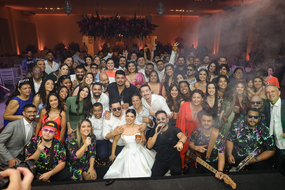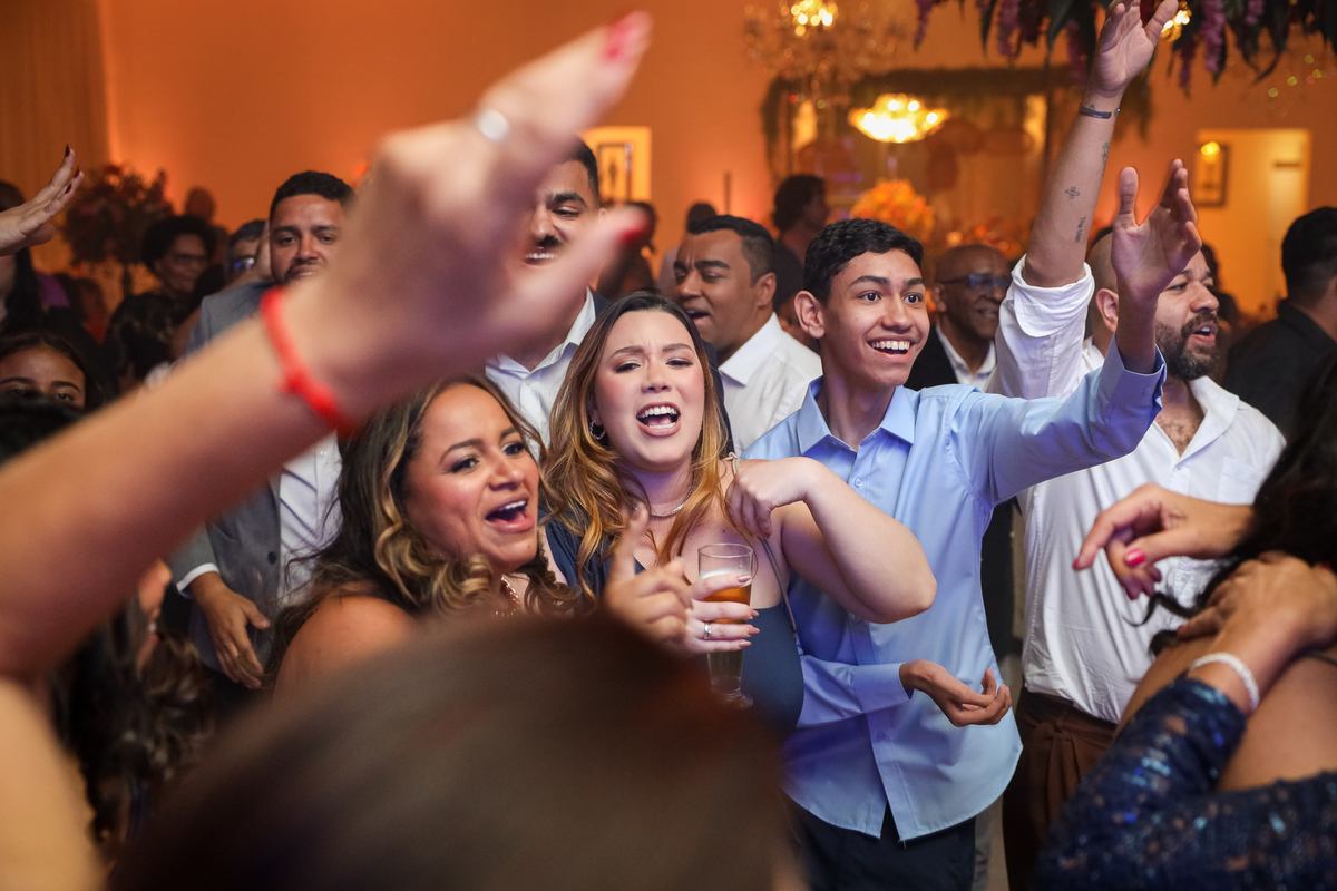 Após a cerimônia, os convidados foram recebidos na parte interna do salão, que estava deslumbrante com decoração em tons de laranja, criando uma atmosfera aconchegante e vibrante para a festa. A animação foi garantida por grandes atrações: a Banda Reprise, o DJ Benny e o talentoso Jessé Viana com seu grupo de pagode, que fizeram a pista de dança ficar cheia do início ao fim.