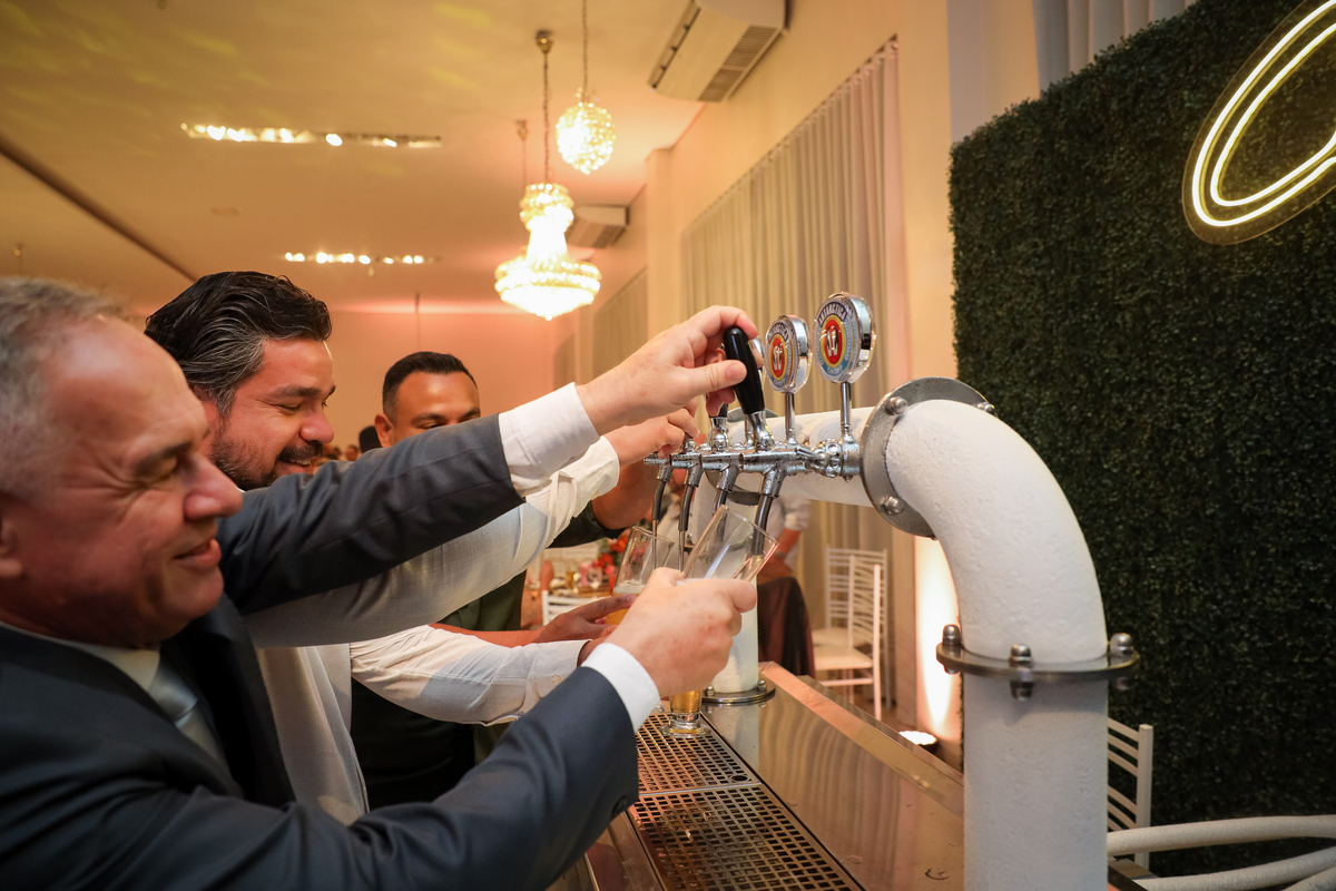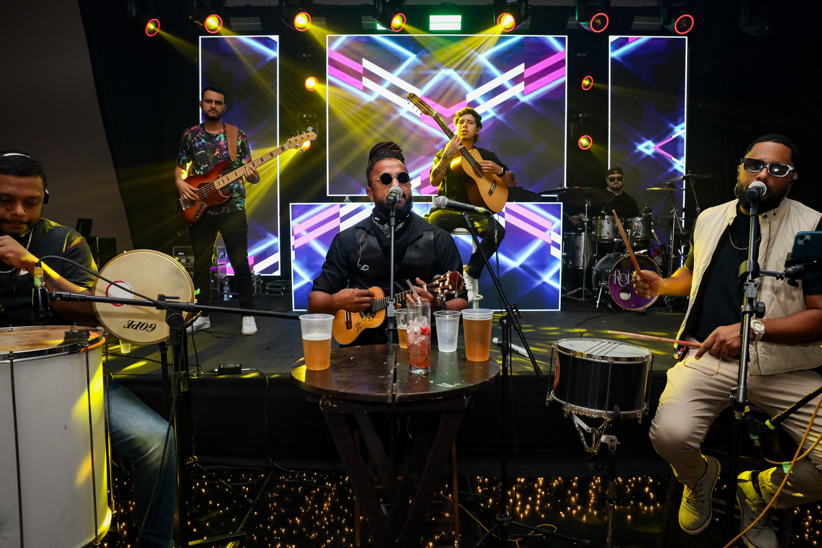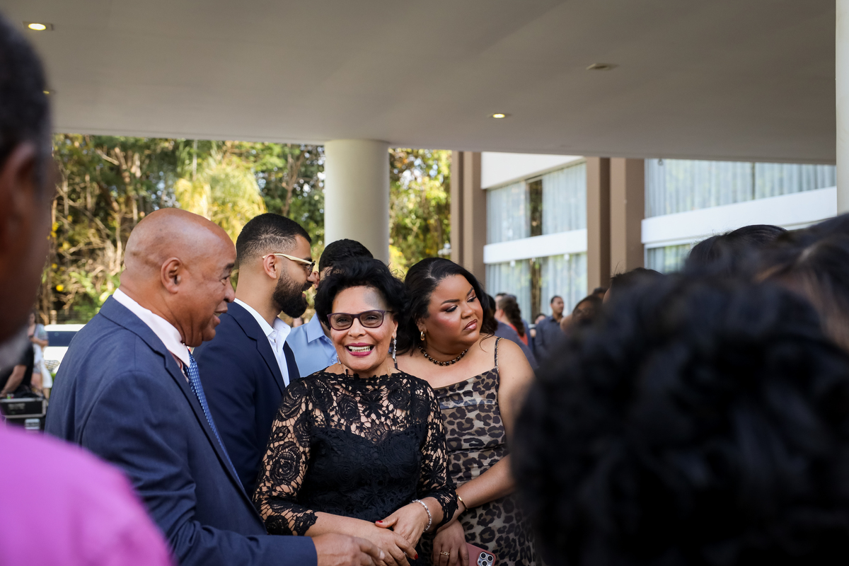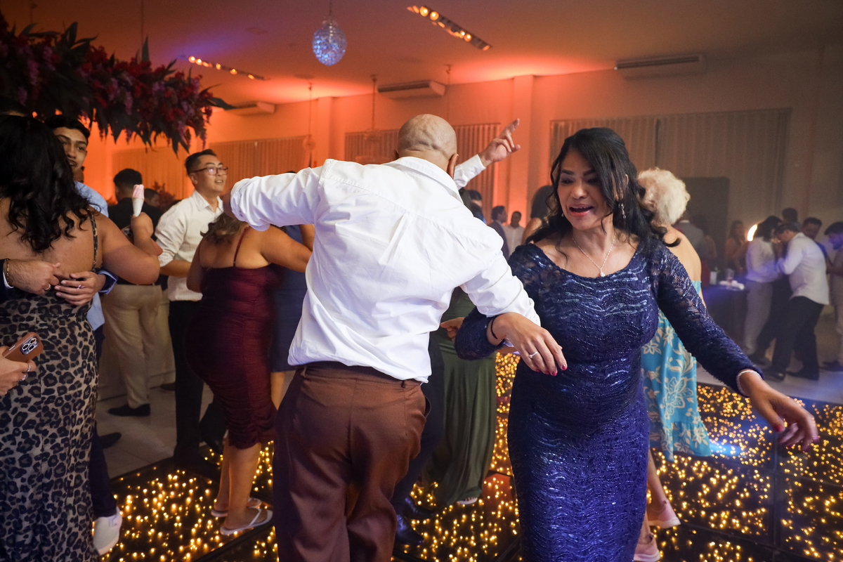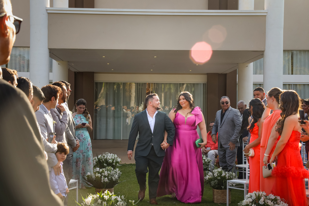 Após a cerimônia, os convidados foram recebidos na parte interna do salão, que estava deslumbrante com decoração em tons de laranja, criando uma atmosfera aconchegante e vibrante para a festa. A animação foi garantida por grandes atrações: a Banda Reprise, o DJ Benny e o talentoso Jessé Viana com seu grupo de pagode, que fizeram a pista de dança ficar cheia do início ao fim.