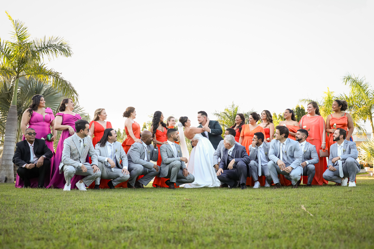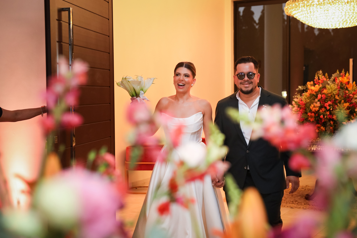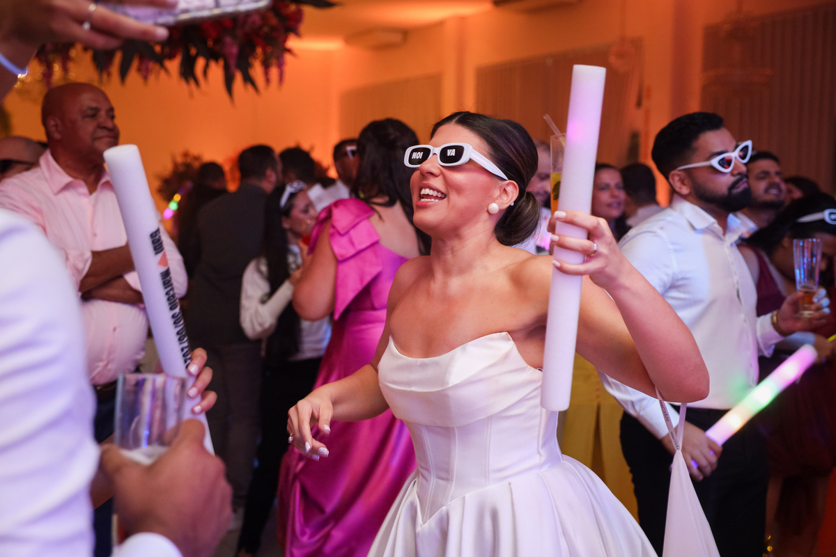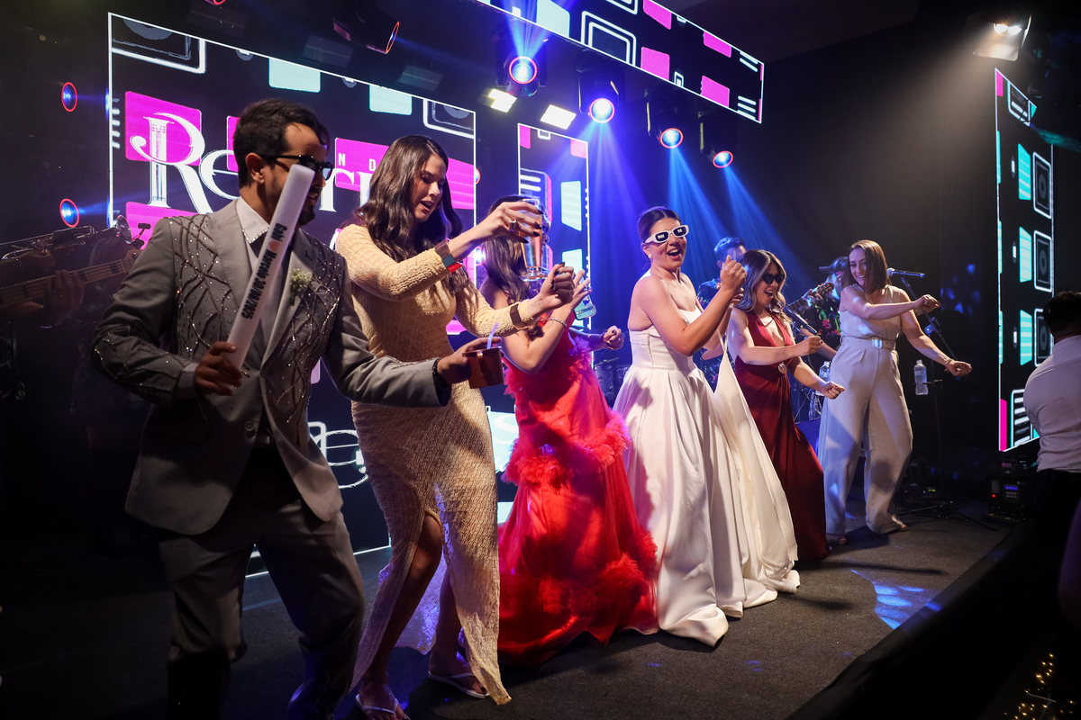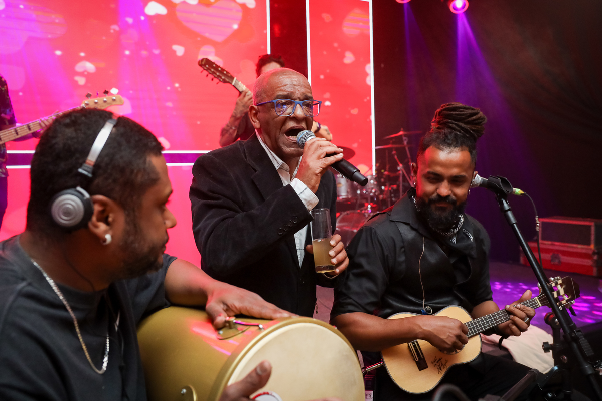 Após a cerimônia, os convidados foram recebidos na parte interna do salão, que estava deslumbrante com decoração em tons de laranja, criando uma atmosfera aconchegante e vibrante para a festa. A animação foi garantida por grandes atrações: a Banda Reprise, o DJ Benny e o talentoso Jessé Viana com seu grupo de pagode, que fizeram a pista de dança ficar cheia do início ao fim.