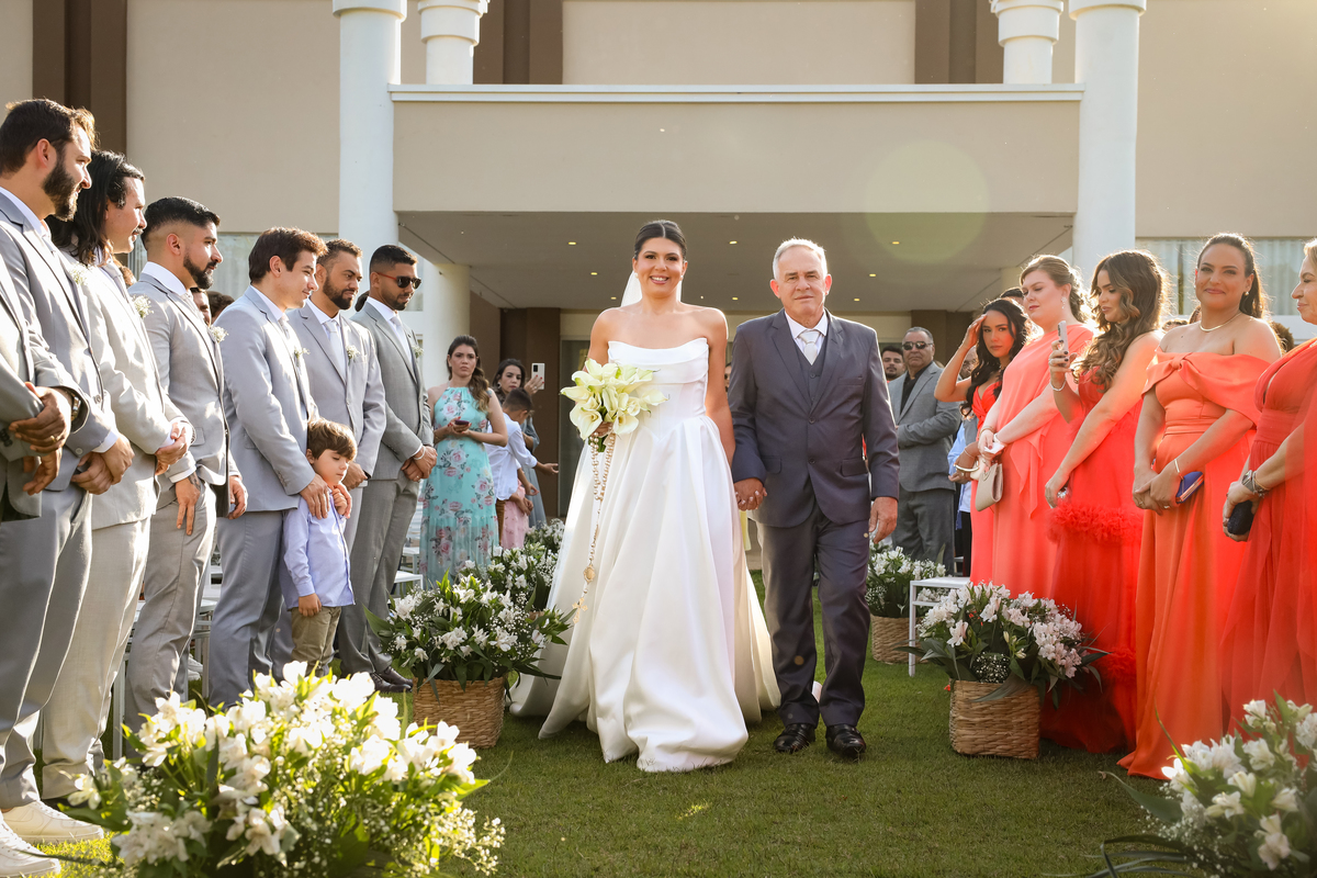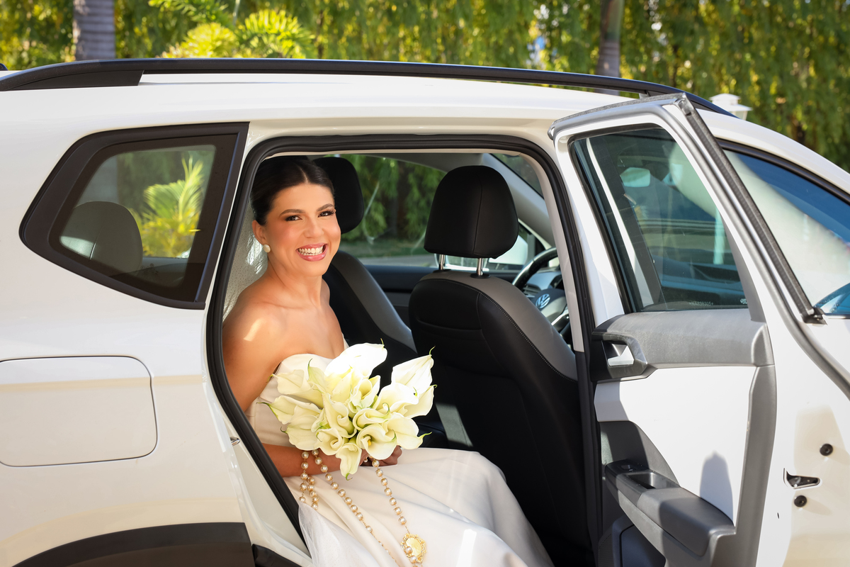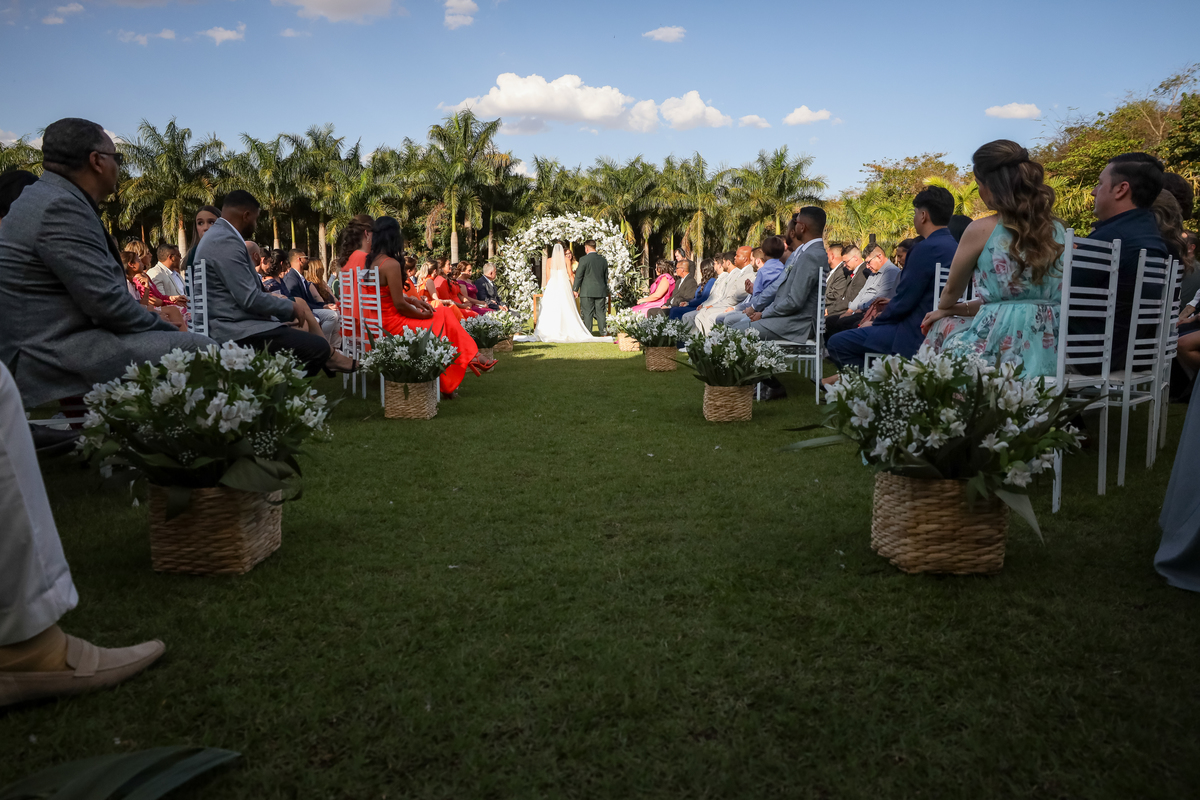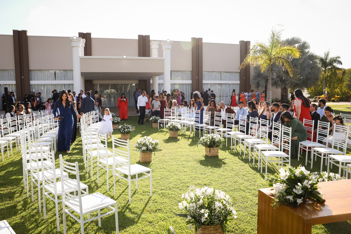 A decoração em tons de branco trouxe leveza e elegância, destacando o arco de flores brancas no altar, que se tornou o ponto perfeito para o “sim” tão esperado.