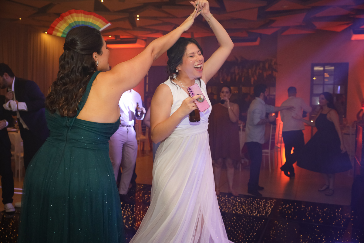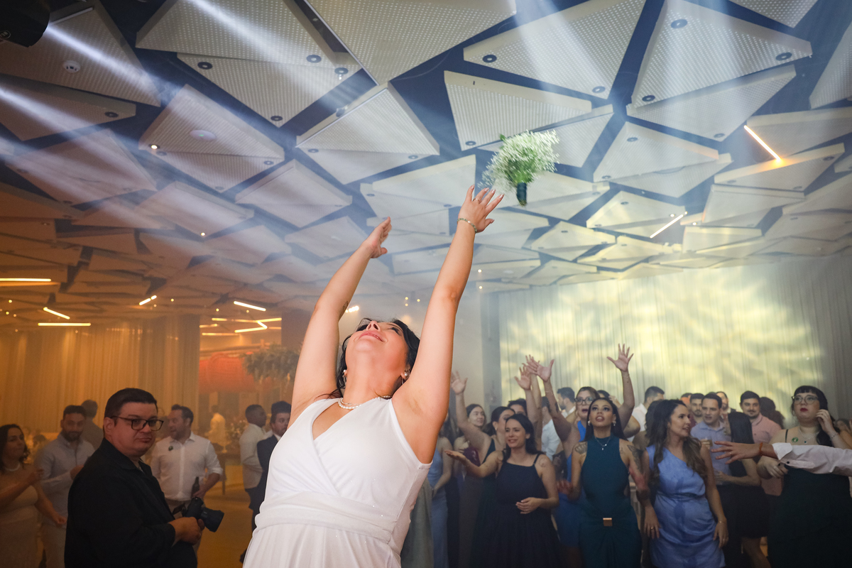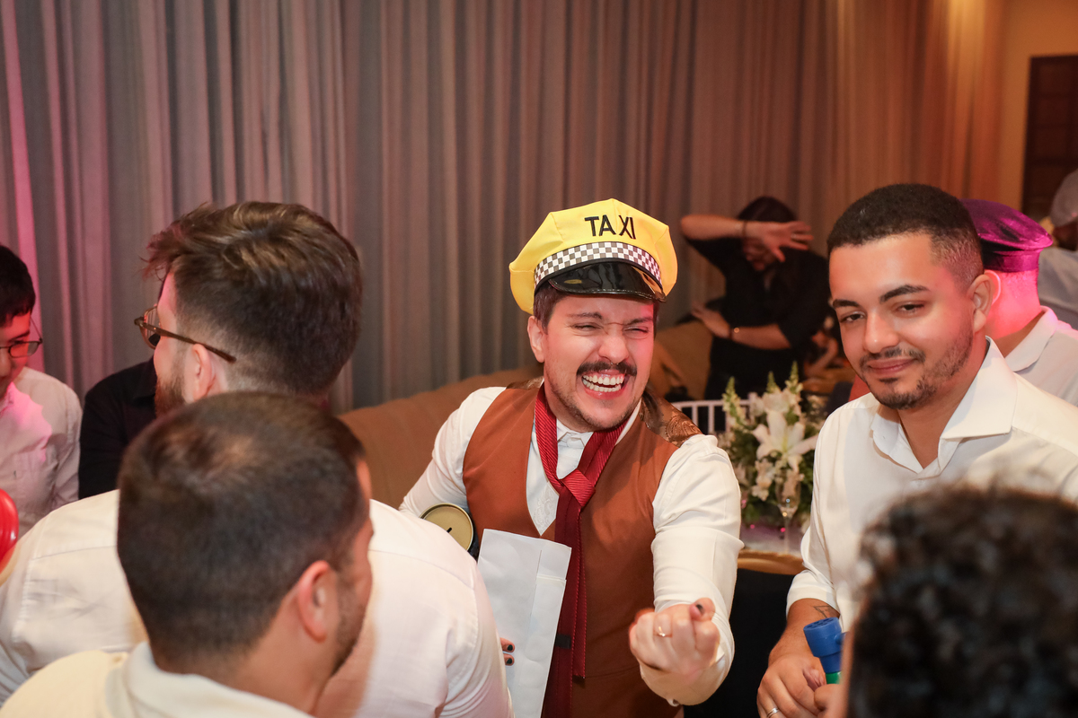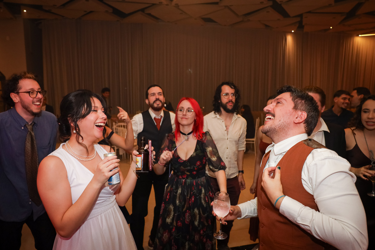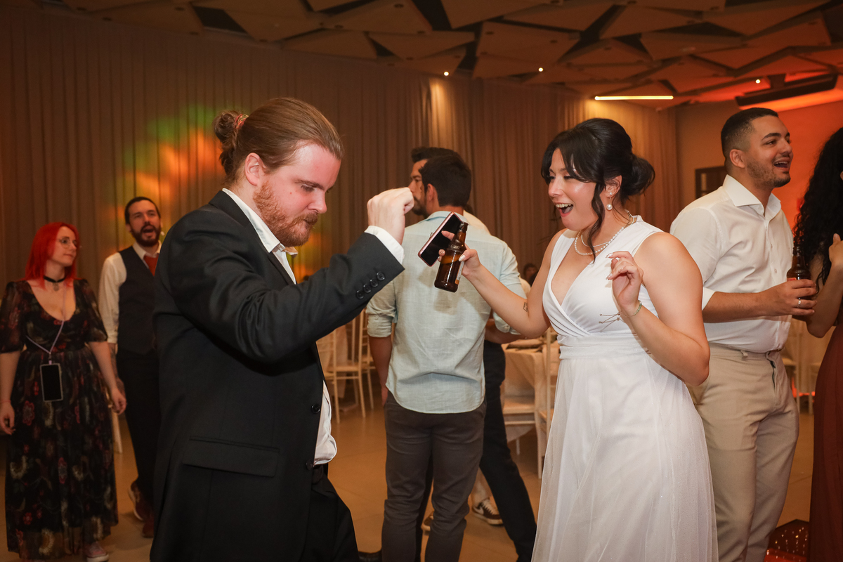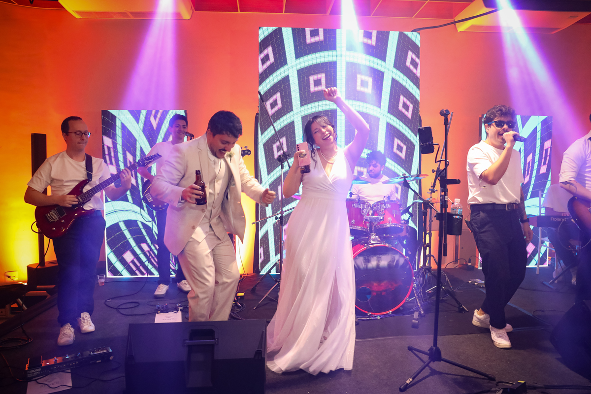 Após a cerimônia, os noivos receberam os convidados nas dependências internas do salão, em uma recepção animada com banda e DJ que mantiveram a pista cheia do início ao fim. A decoração combinava perfeitamente com o estilo leve e alegre do casal, criando um ambiente acolhedor e cheio de boas vibrações.