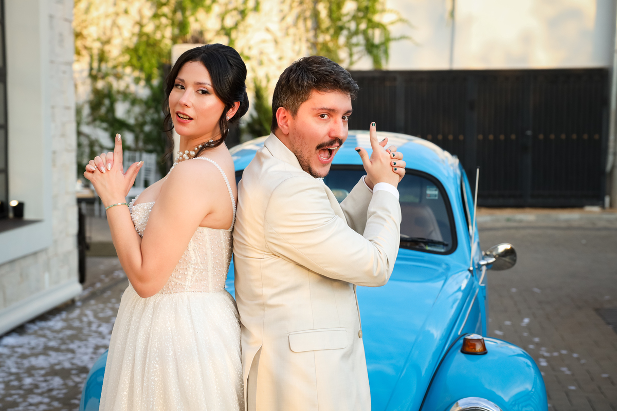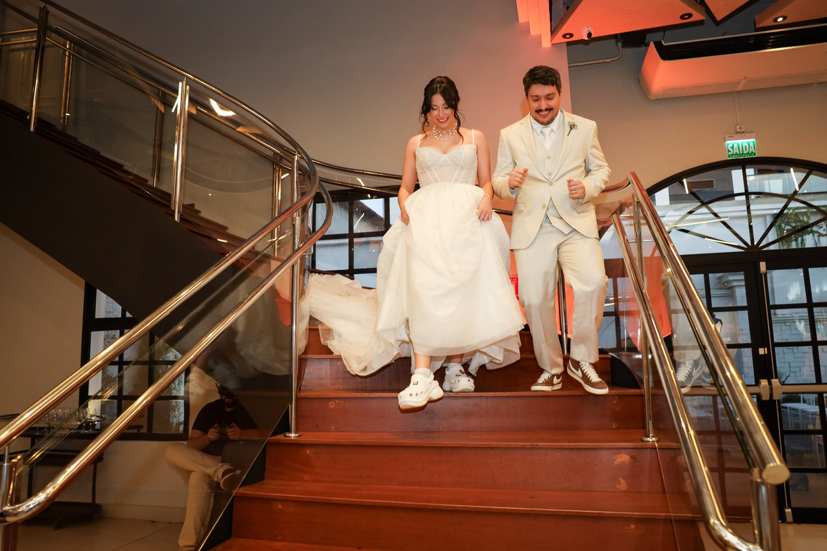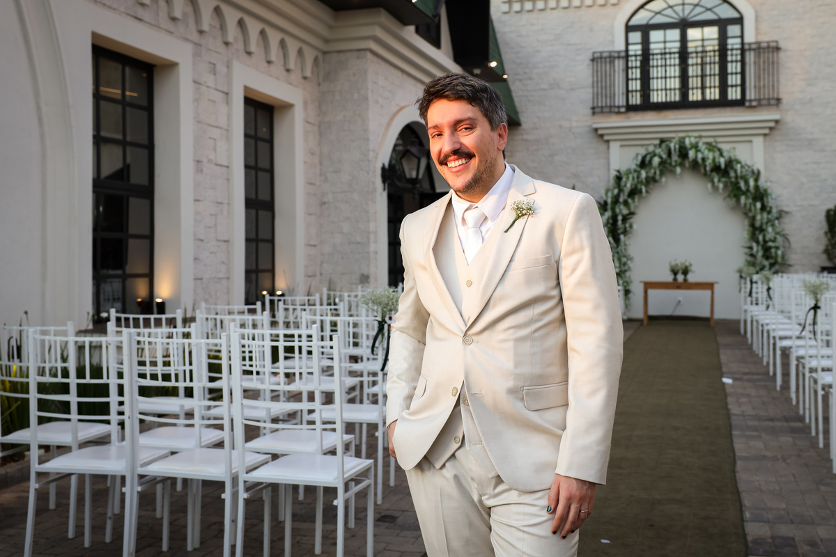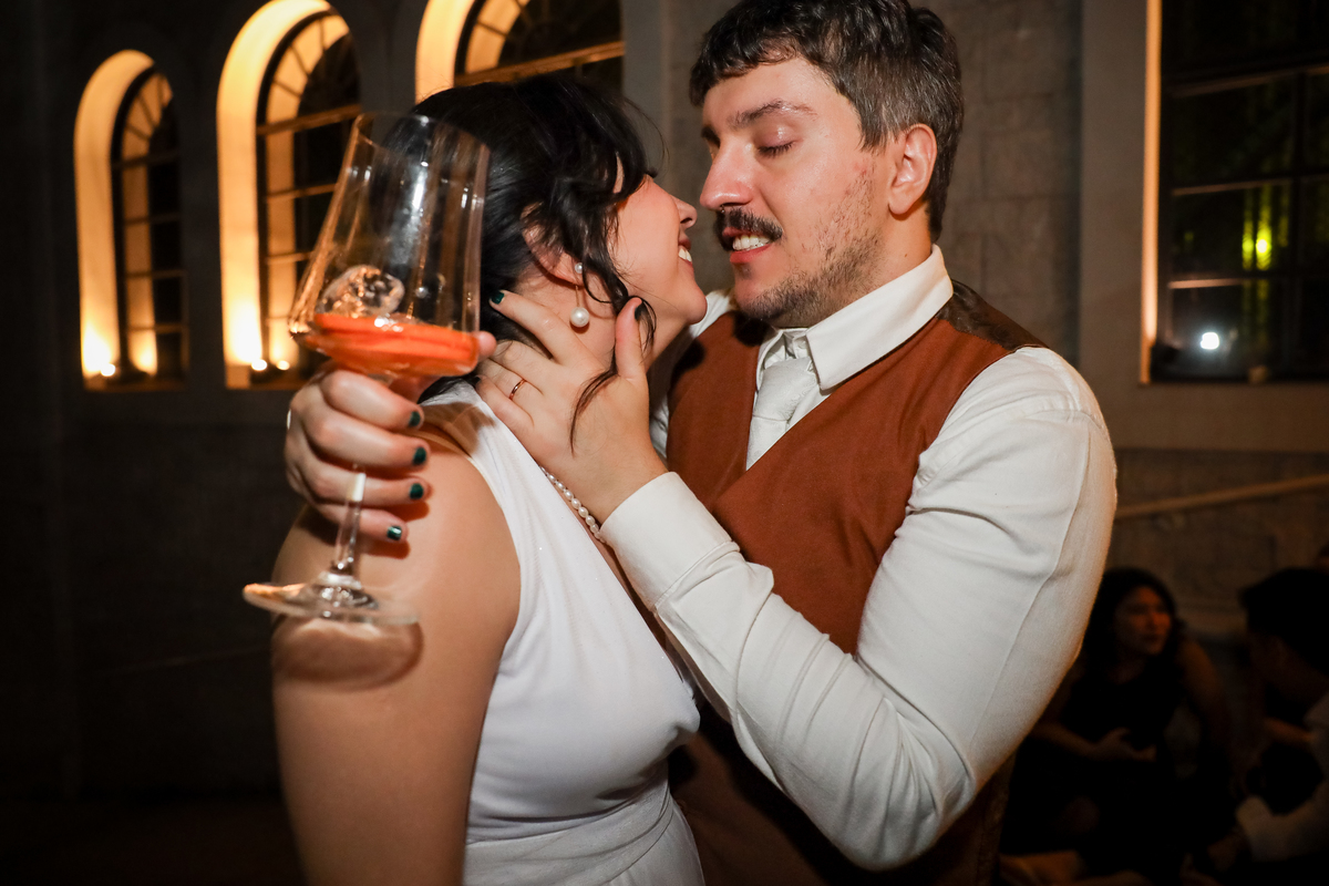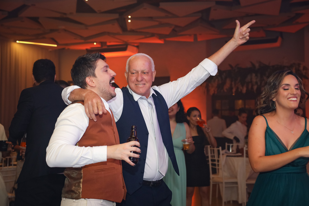 Após a cerimônia, os noivos receberam os convidados nas dependências internas do salão, em uma recepção animada com banda e DJ que mantiveram a pista cheia do início ao fim. A decoração combinava perfeitamente com o estilo leve e alegre do casal, criando um ambiente acolhedor e cheio de boas vibrações.