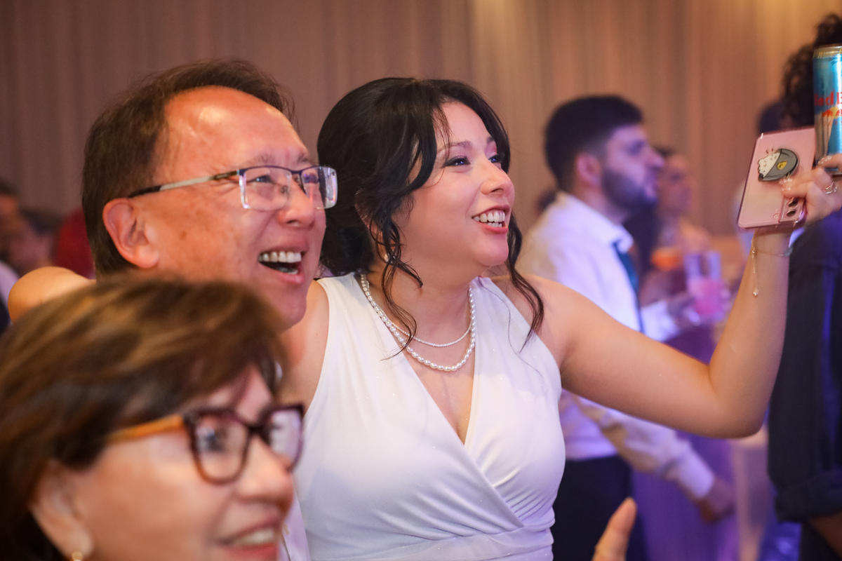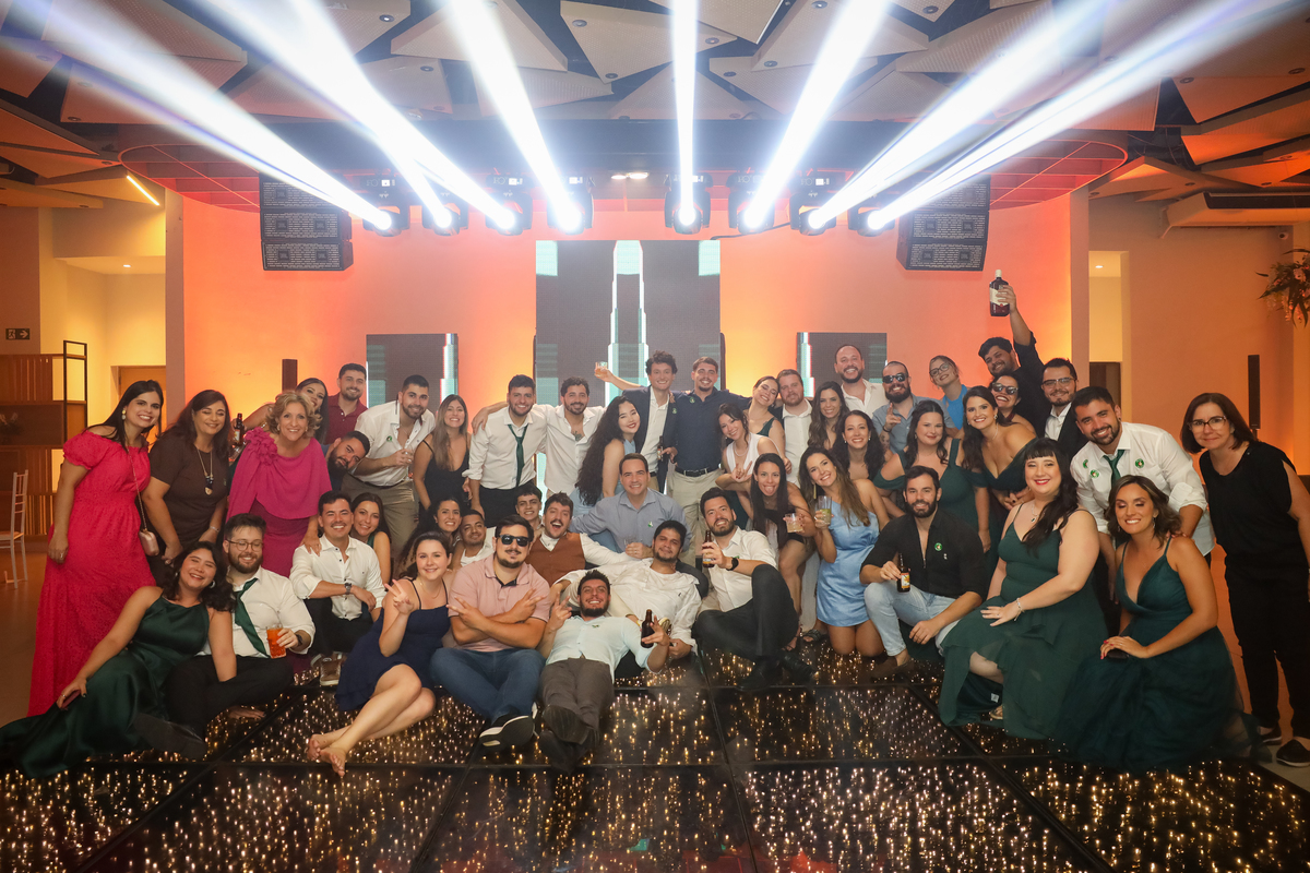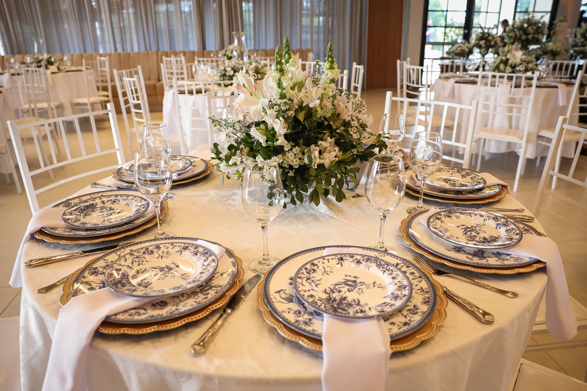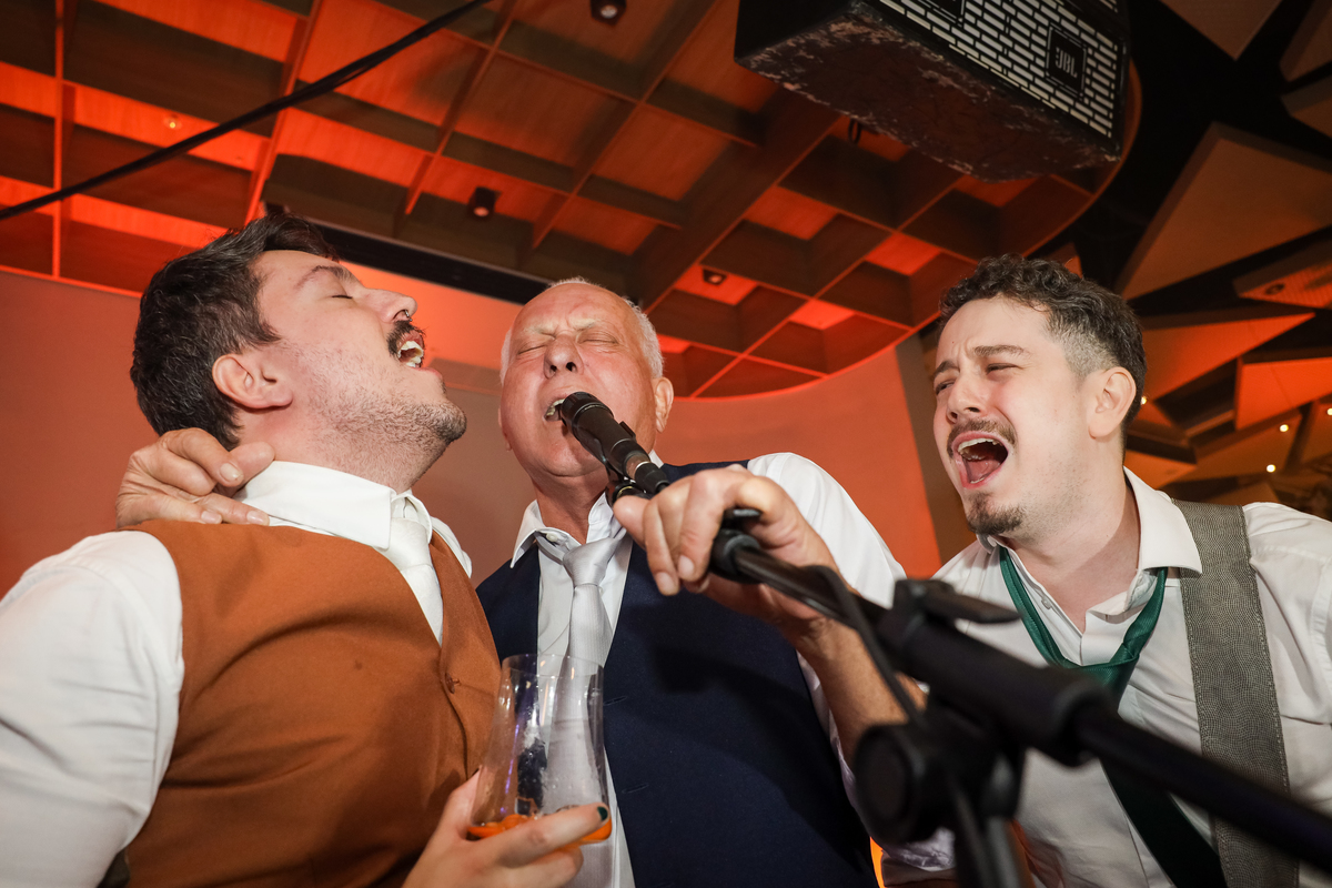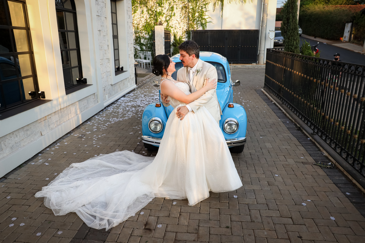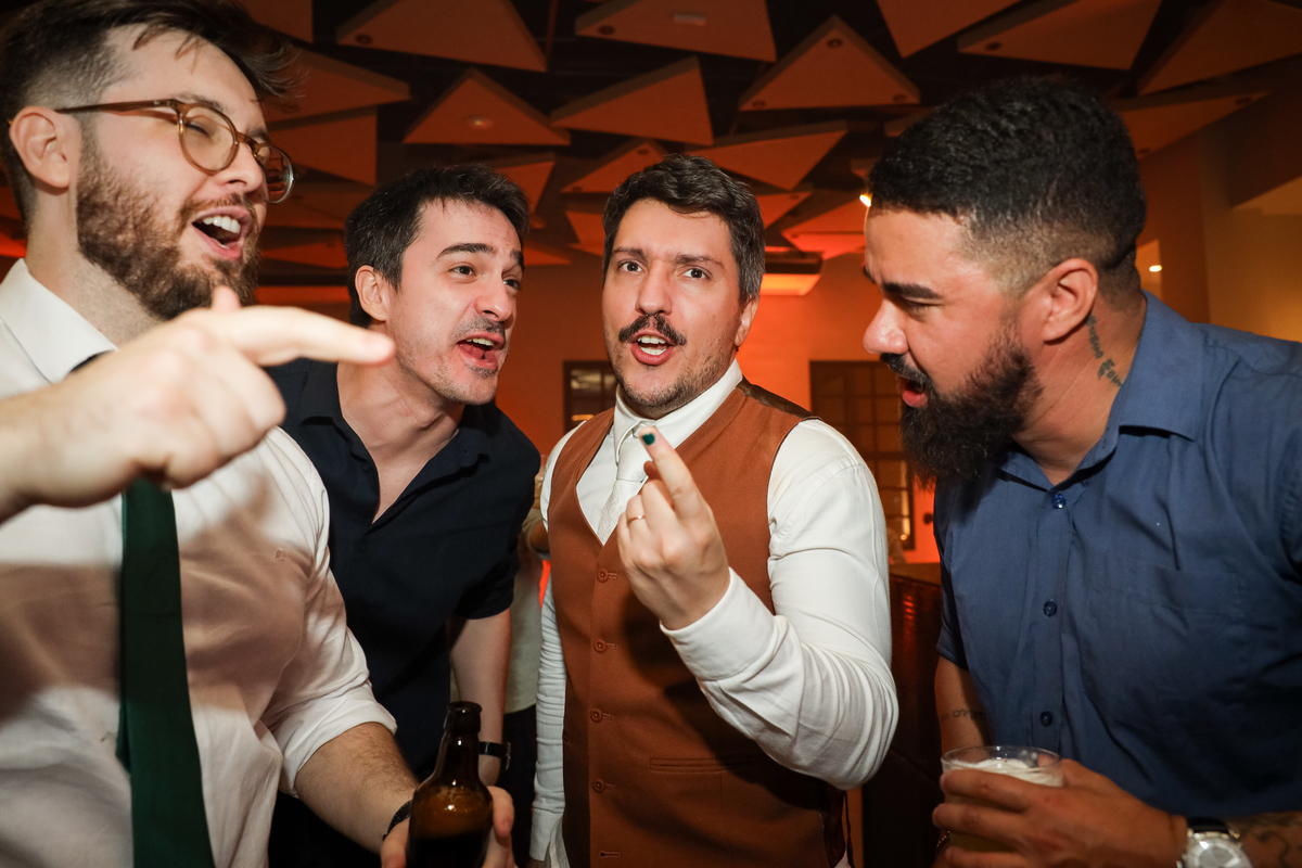 Após a cerimônia, os noivos receberam os convidados nas dependências internas do salão, em uma recepção animada com banda e DJ que mantiveram a pista cheia do início ao fim. A decoração combinava perfeitamente com o estilo leve e alegre do casal, criando um ambiente acolhedor e cheio de boas vibrações.
