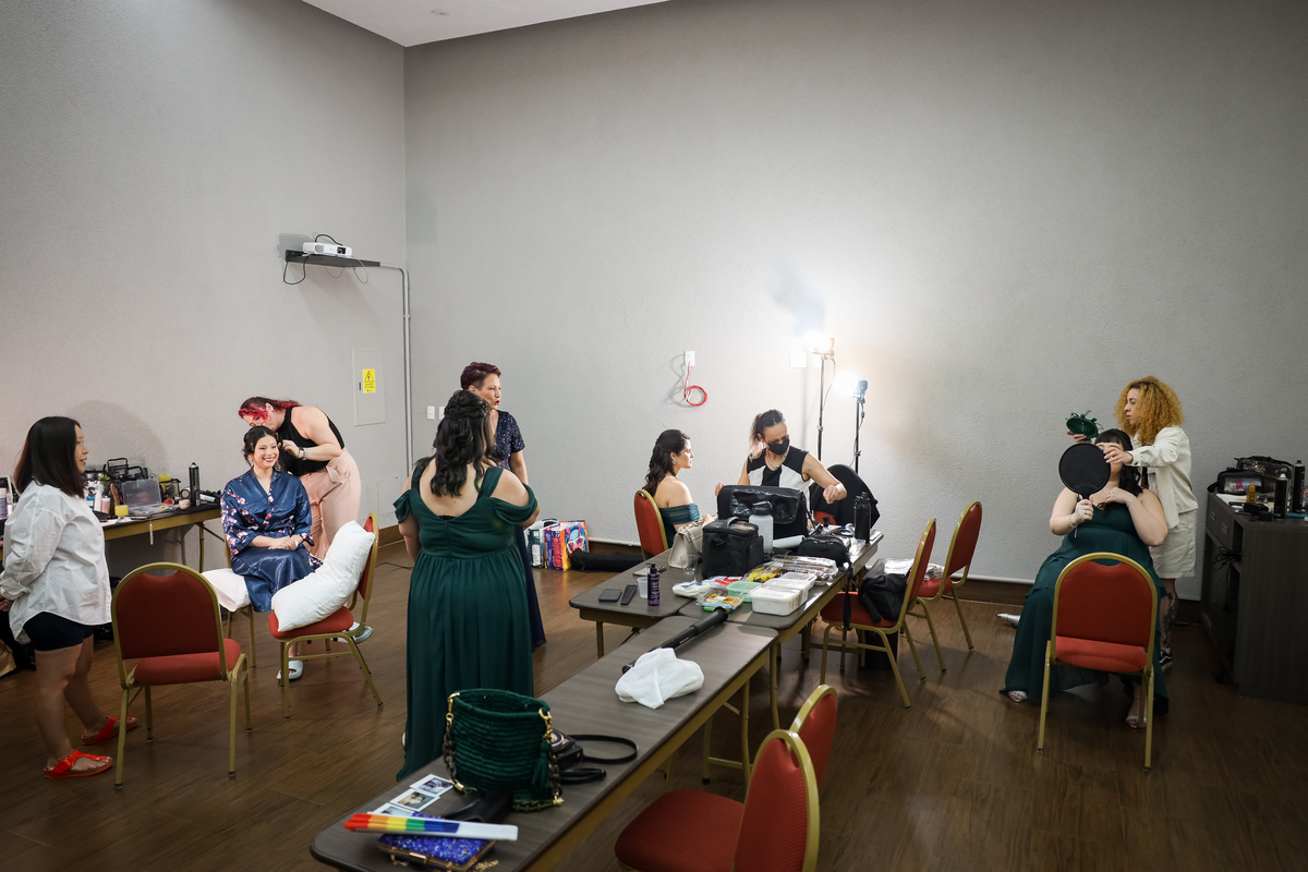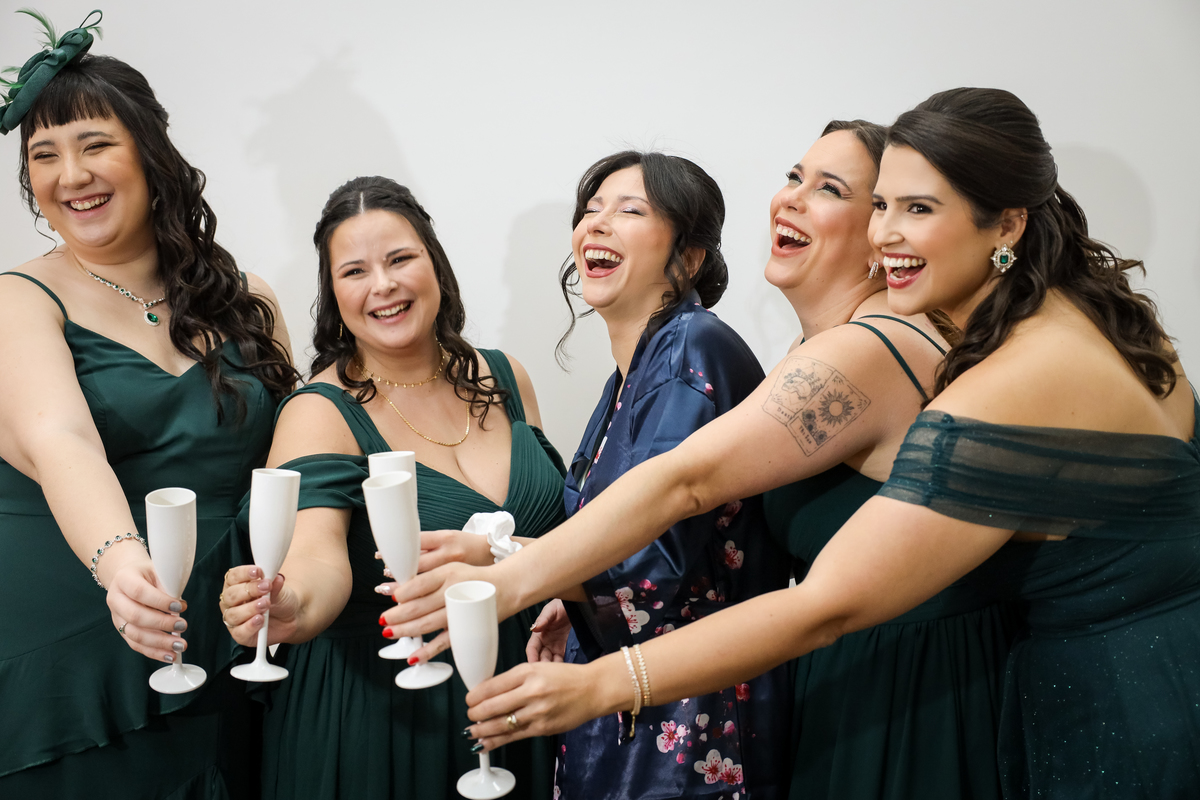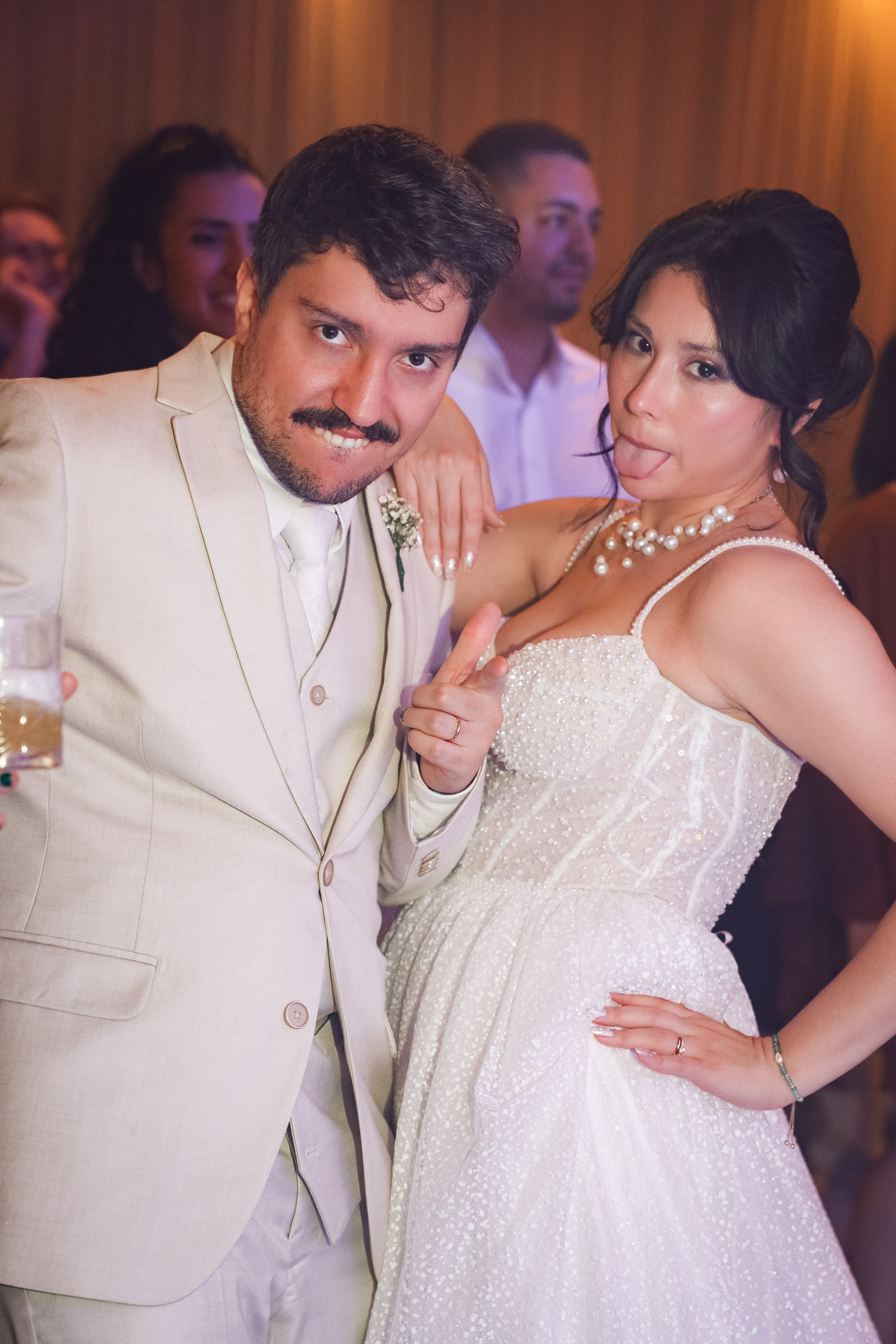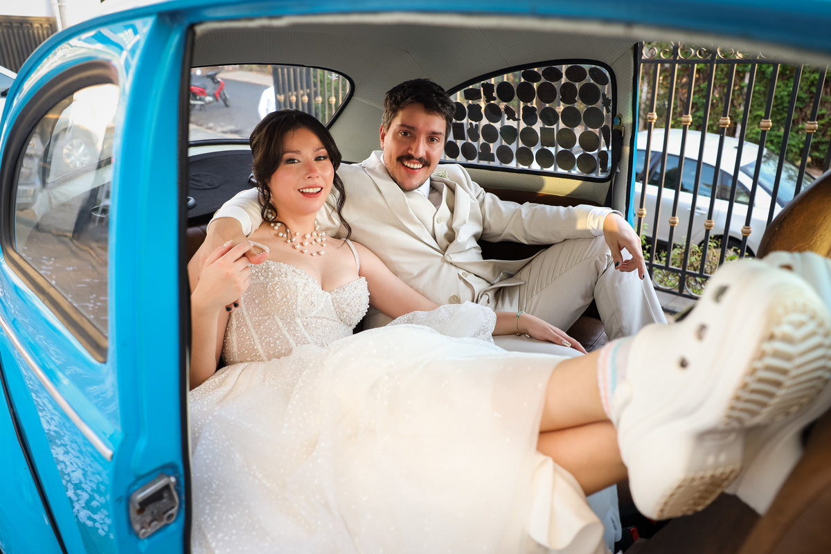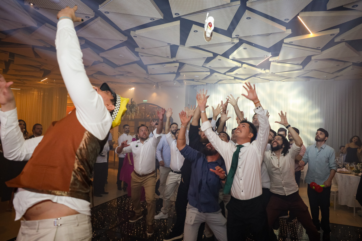 Após a cerimônia, os noivos receberam os convidados nas dependências internas do salão, em uma recepção animada com banda e DJ que mantiveram a pista cheia do início ao fim. A decoração combinava perfeitamente com o estilo leve e alegre do casal, criando um ambiente acolhedor e cheio de boas vibrações.