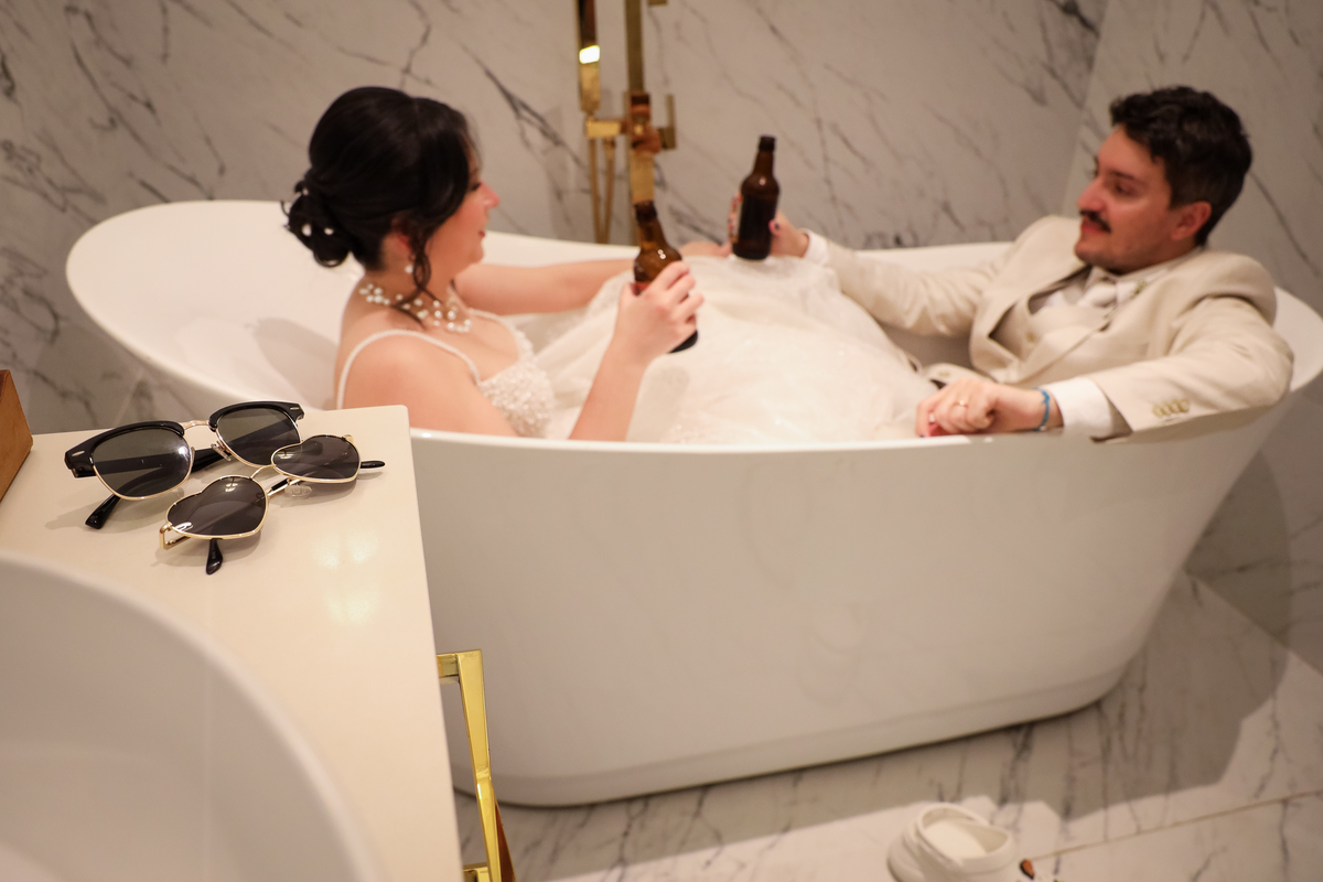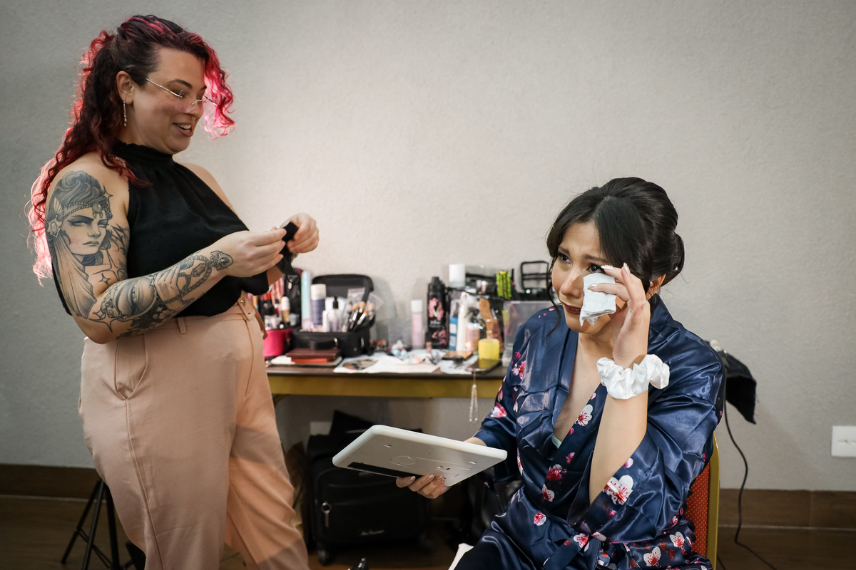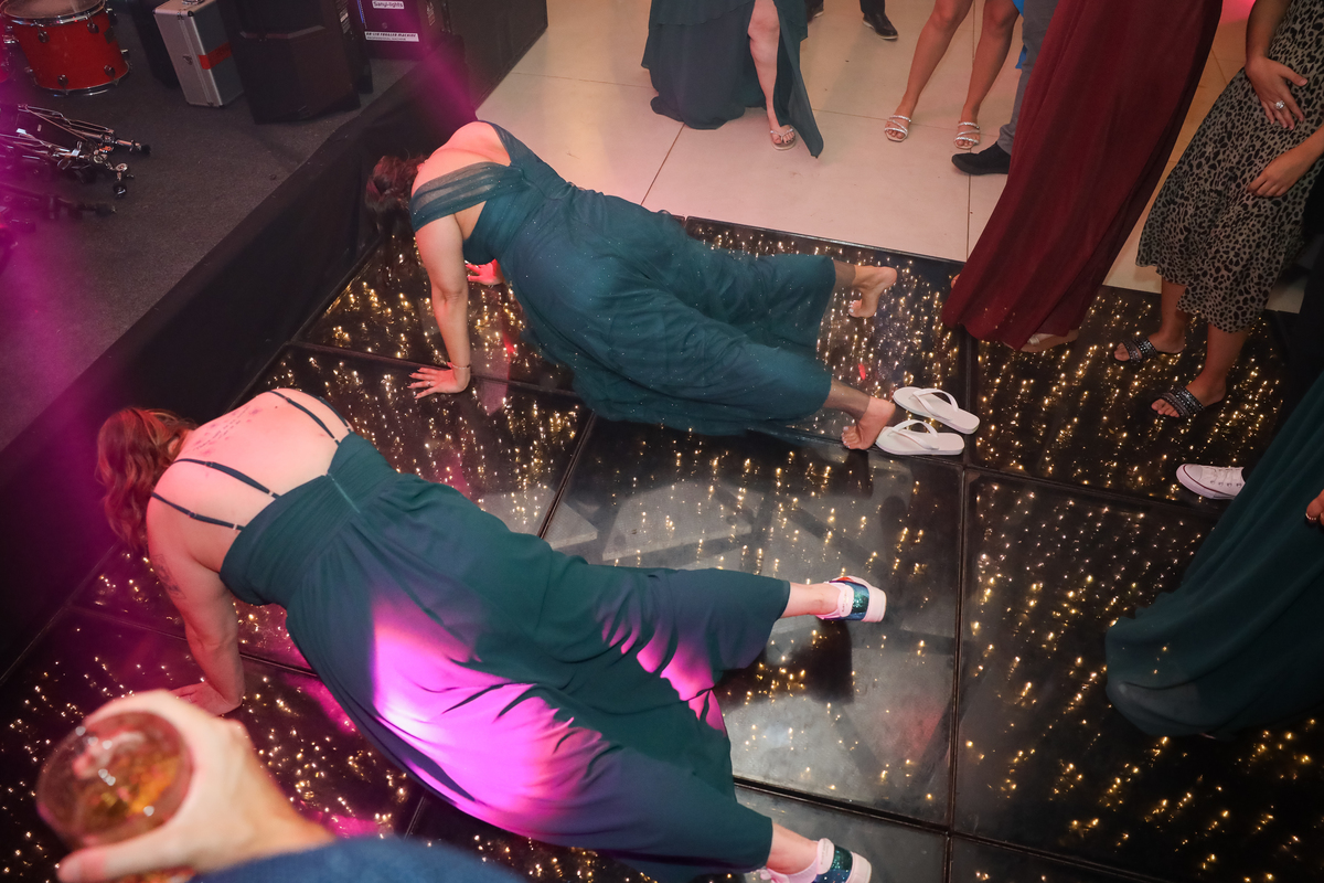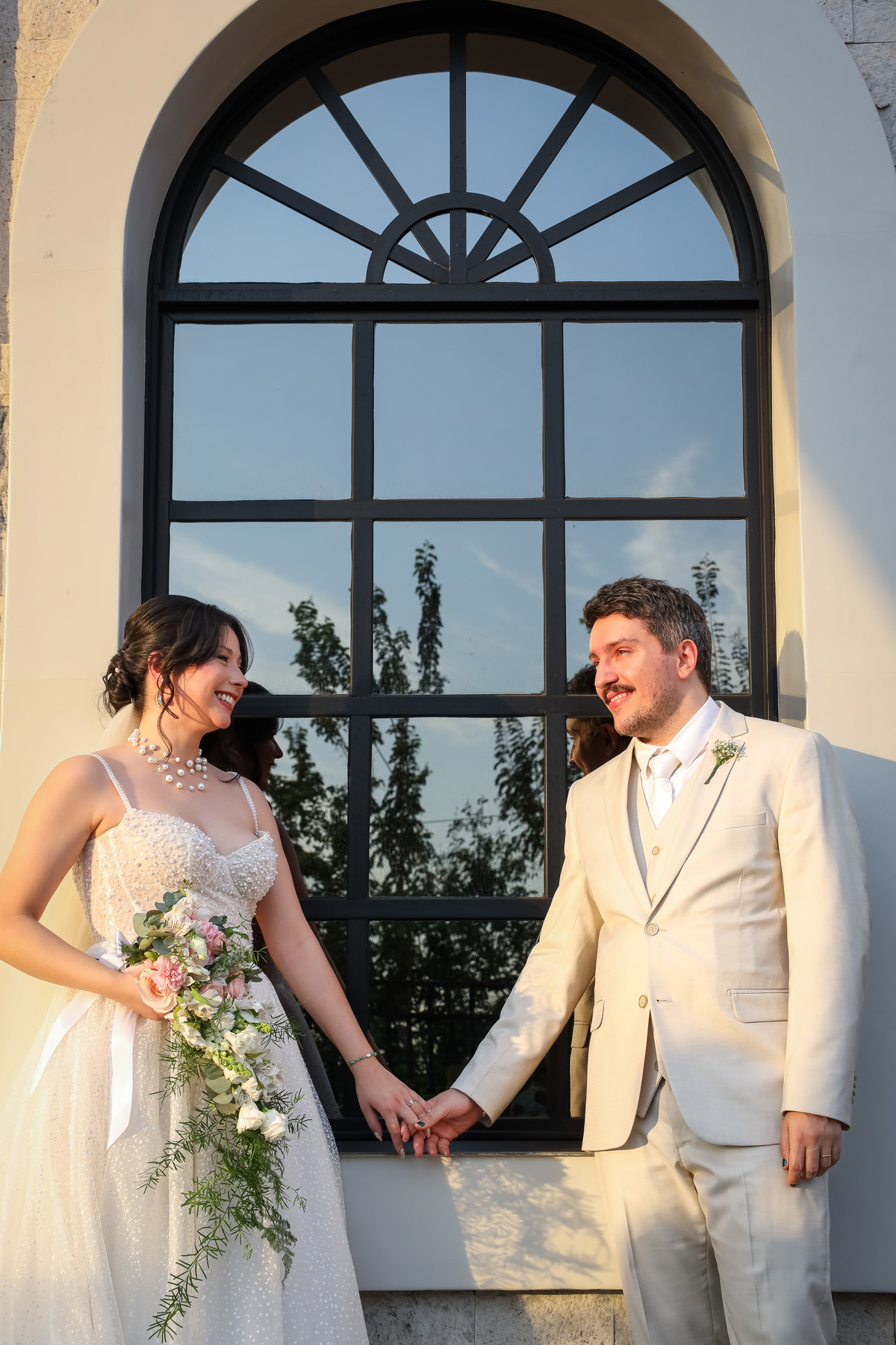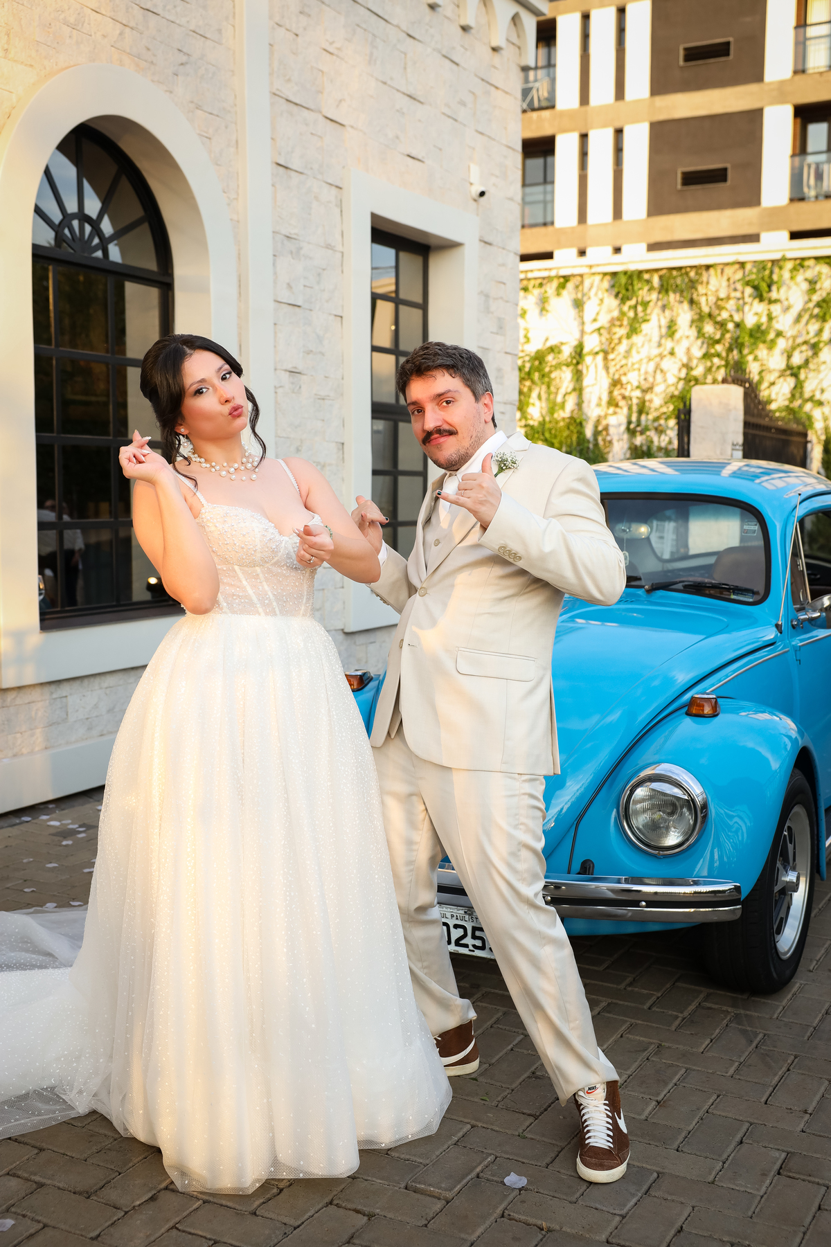Após a cerimônia, os noivos receberam os convidados nas dependências internas do salão, em uma recepção animada com banda e DJ que mantiveram a pista cheia do início ao fim. A decoração combinava perfeitamente com o estilo leve e alegre do casal, criando um ambiente acolhedor e cheio de boas vibrações.