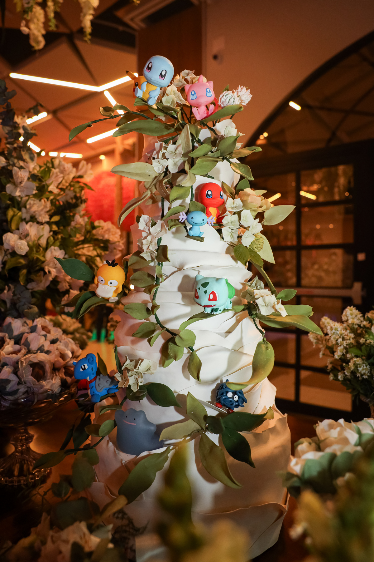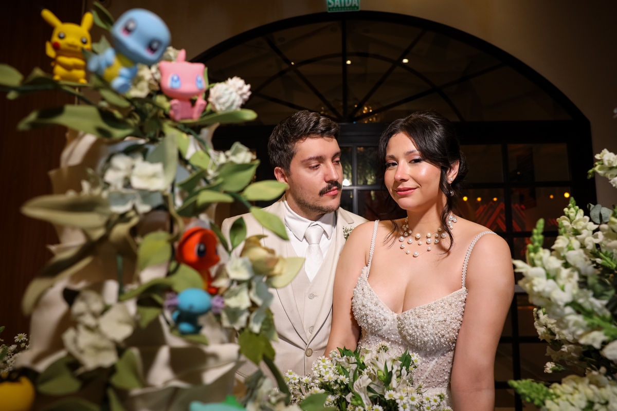 Um dos destaques da noite foi o bolo de casamento, que surpreendeu a todos com detalhes criativos e divertidos — repleto de Pokémons, refletindo a personalidade e o toque especial dos noivos.