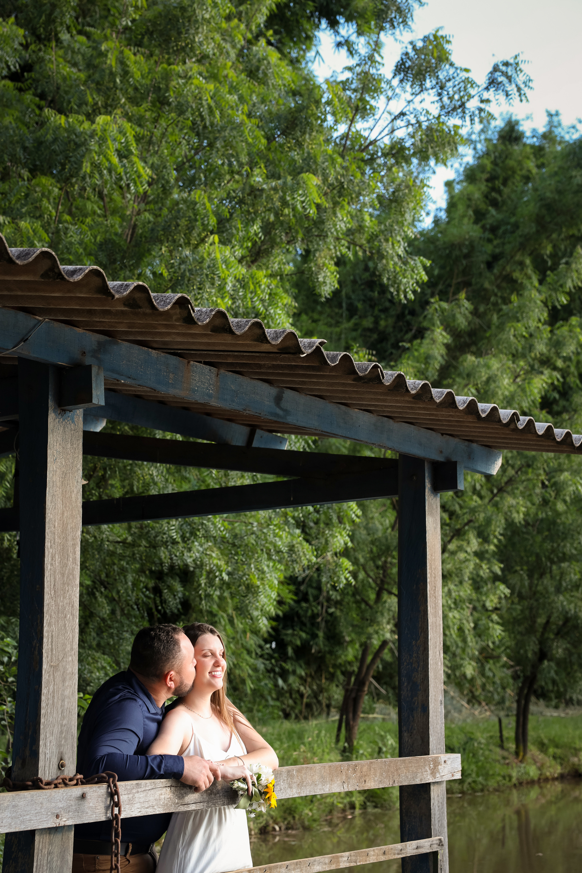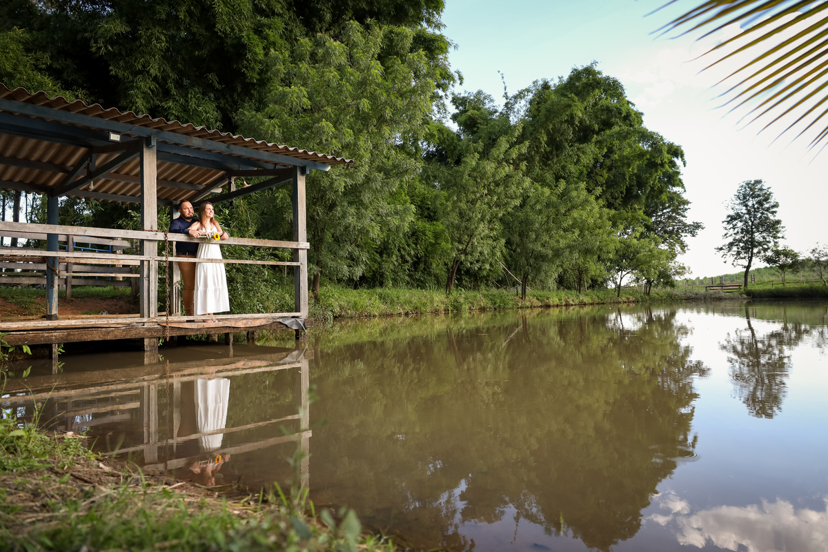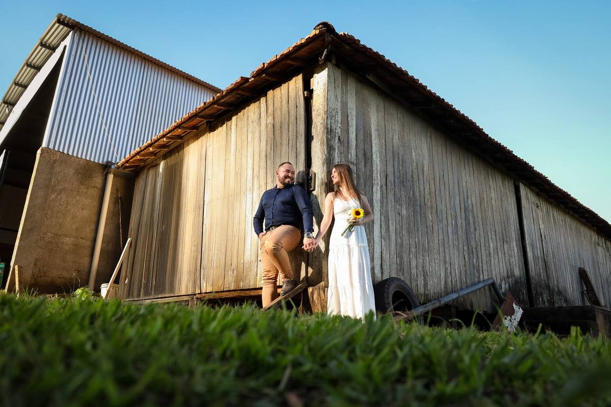 A caminhada começou em meio ao verde exuberante da fazenda, explorando os recantos mais especiais: árvores imponentes que abraçavam o casal em fotos cheias de ternura, um celeiro rústico que deu um toque de charme às imagens e até um pequeno lago onde o reflexo dos dois parecia uma pintura.