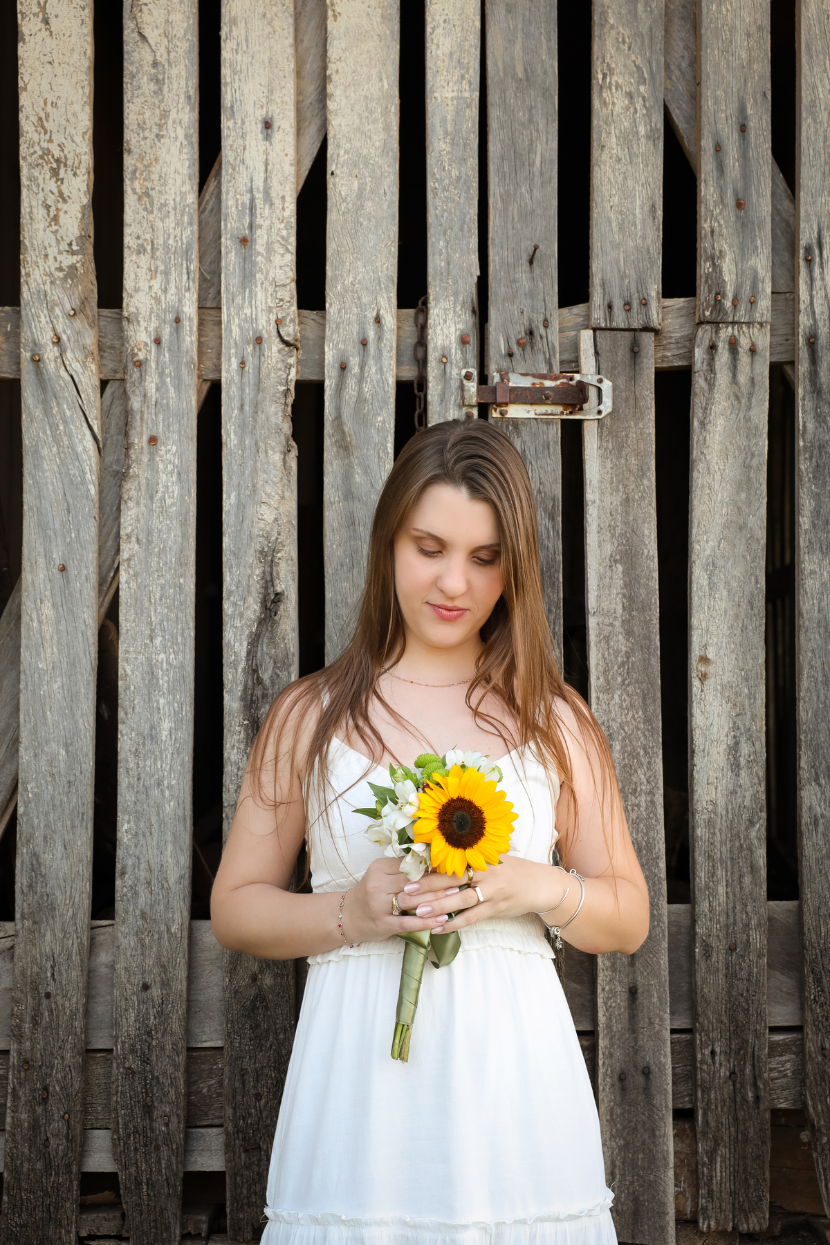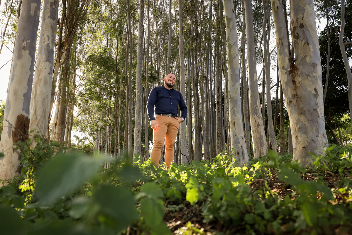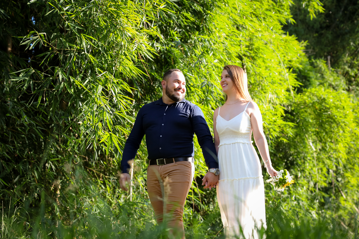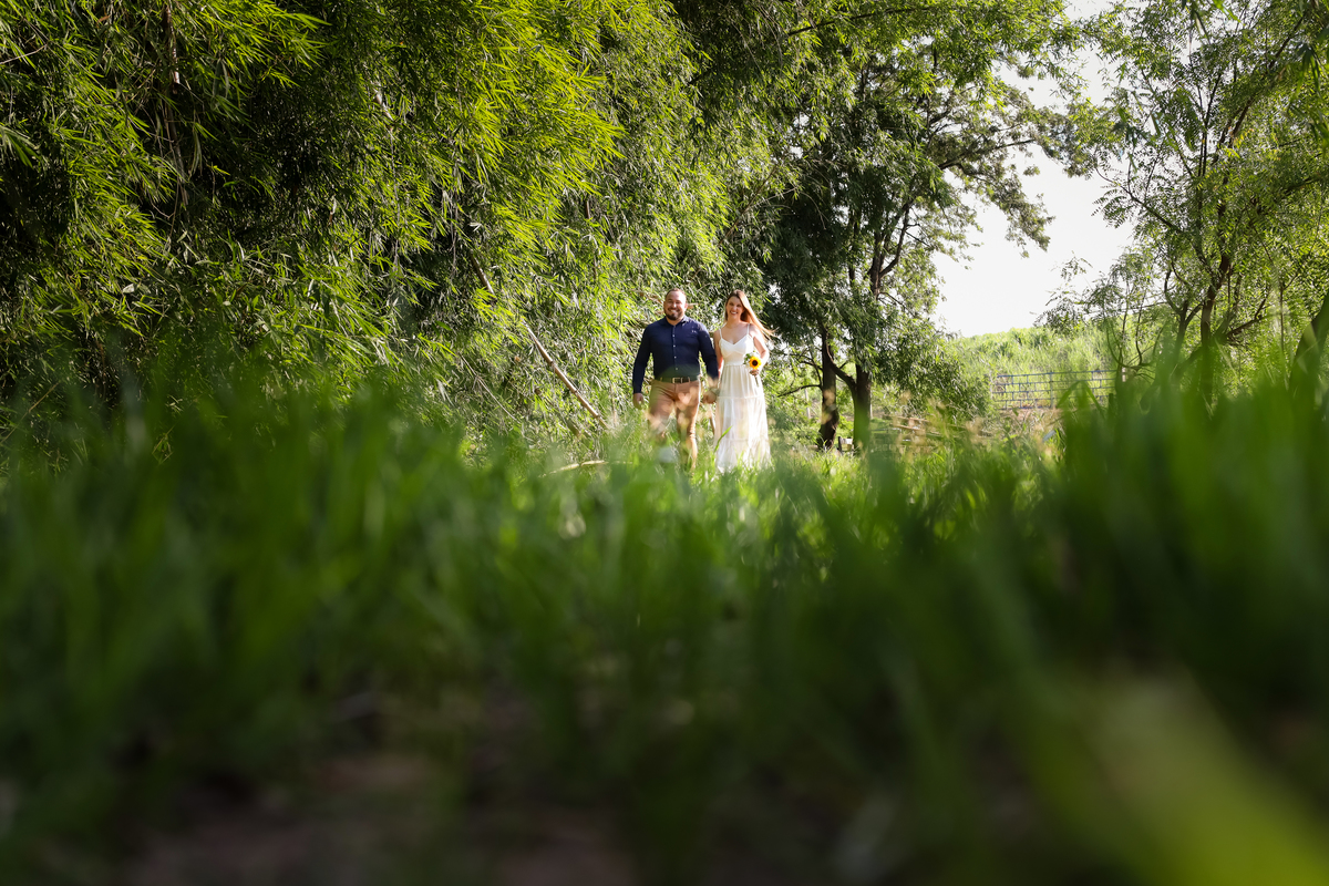 A caminhada começou em meio ao verde exuberante da fazenda, explorando os recantos mais especiais: árvores imponentes que abraçavam o casal em fotos cheias de ternura, um celeiro rústico que deu um toque de charme às imagens e até um pequeno lago onde o reflexo dos dois parecia uma pintura.