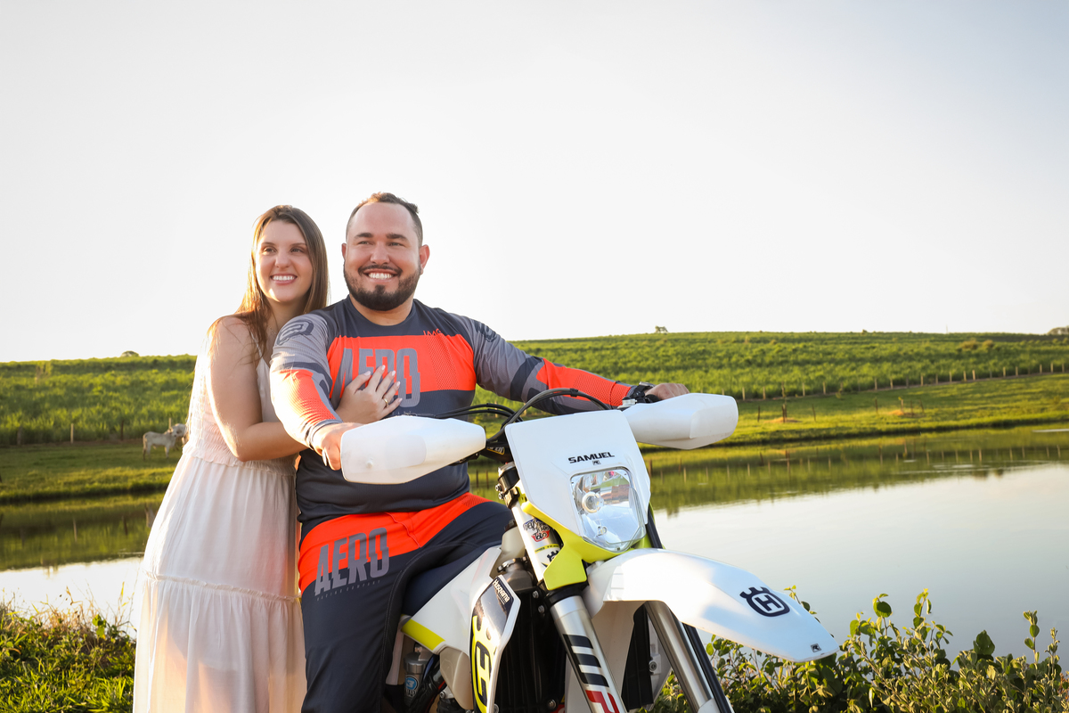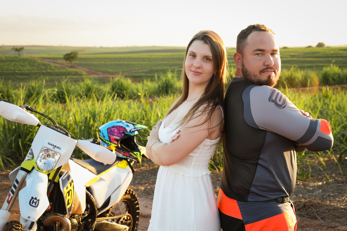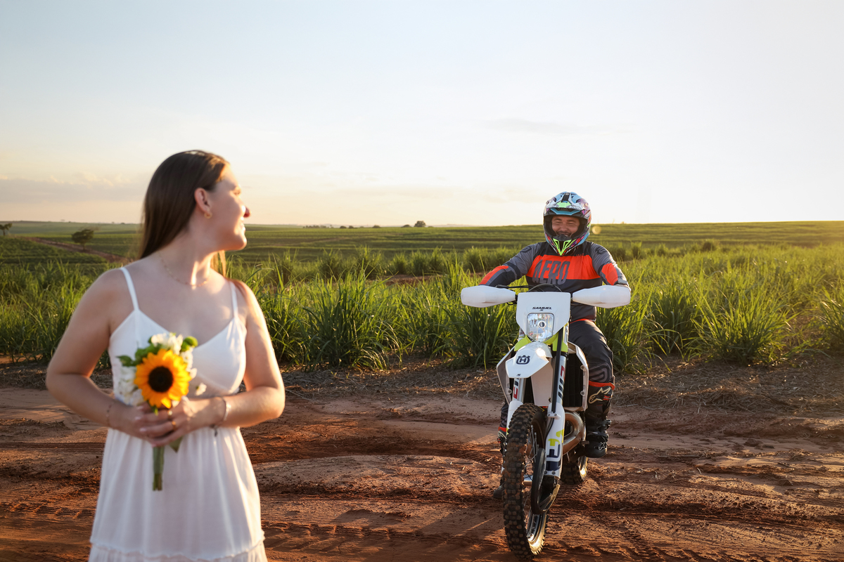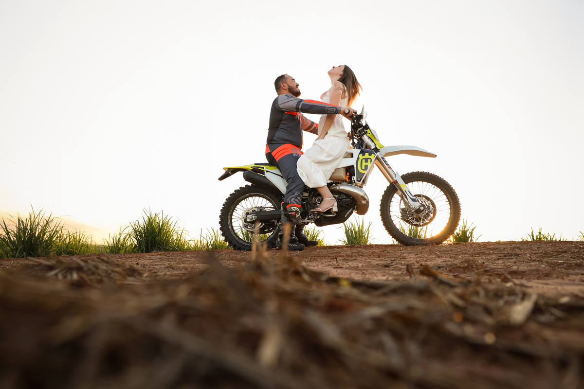 Mas o ponto alto foi quando Samuel trouxe sua moto de trilha para o ensaio. Com um espírito aventureiro e um sorriso que não saía do rosto, ele e Isabela se jogaram em fotos que misturaram adrenalina e romantismo. Foi incrível capturar o contraste entre a delicadeza do amor deles e a energia vibrante das imagens com a moto.