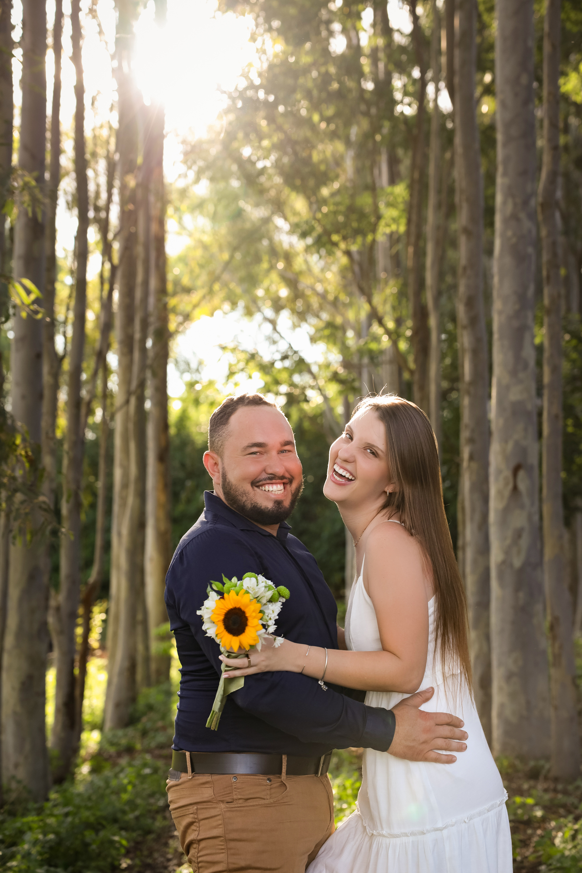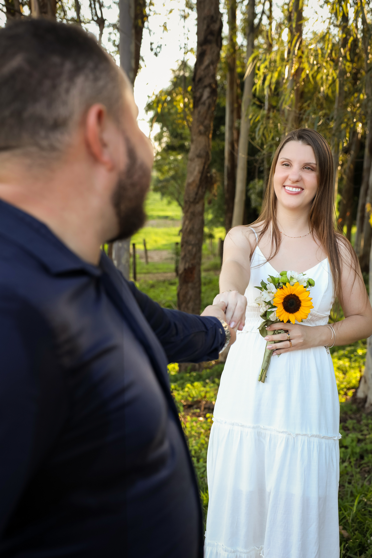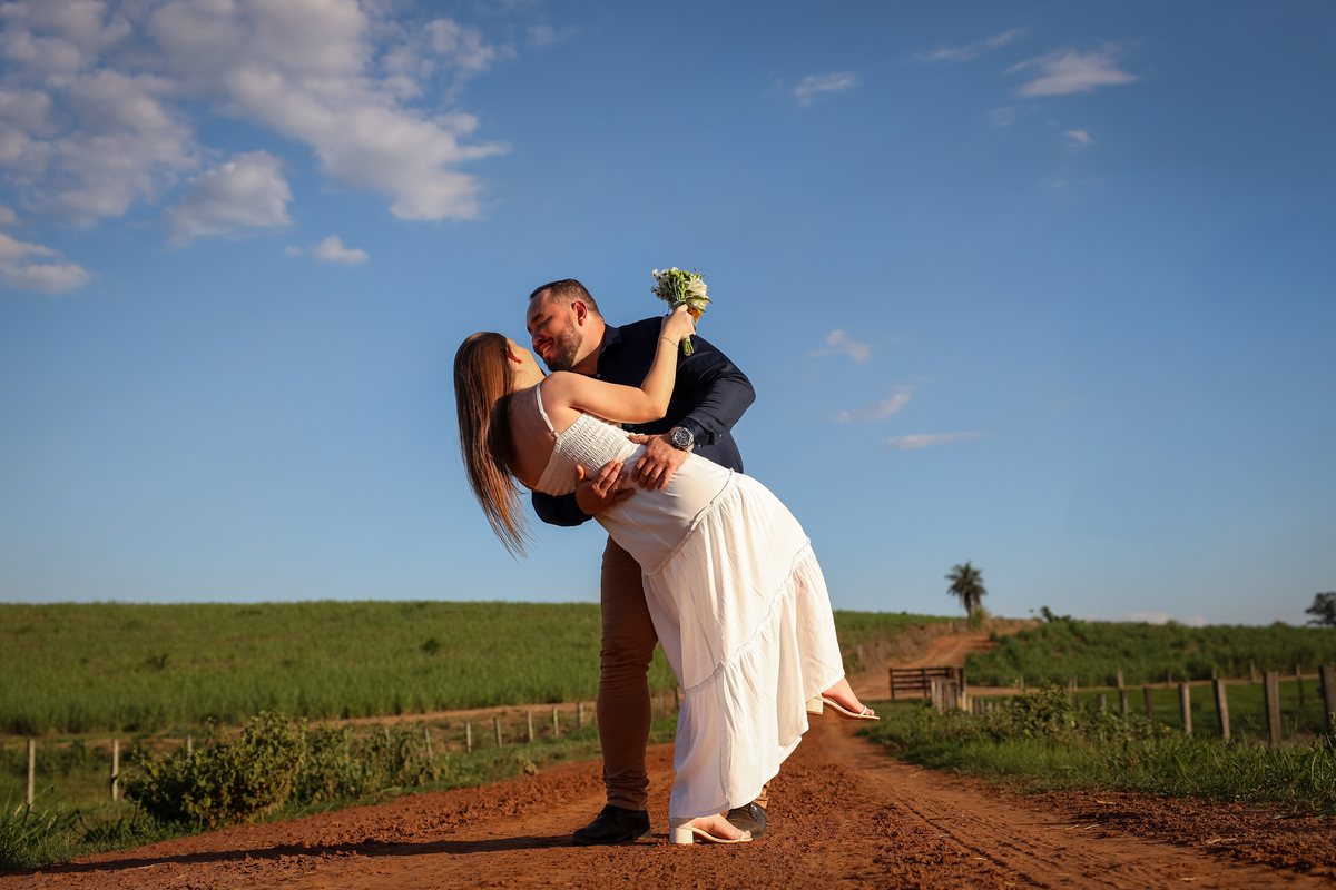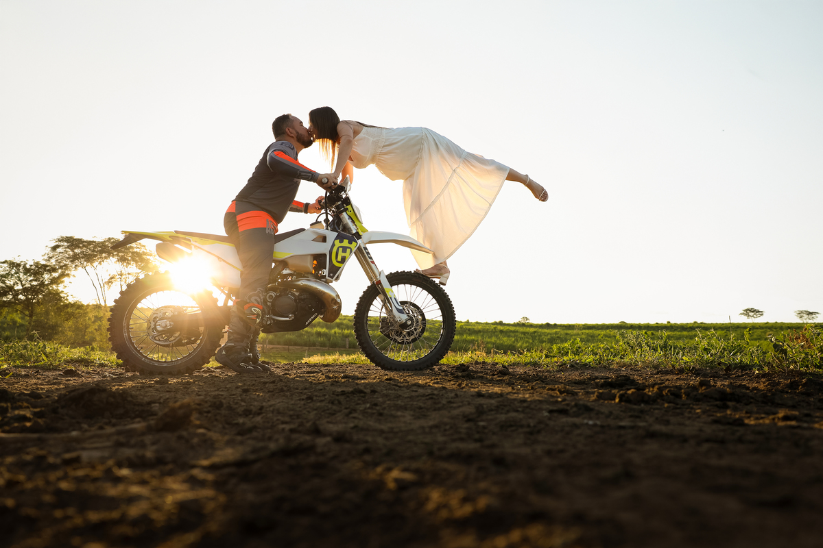 Mas o ponto alto foi quando Samuel trouxe sua moto de trilha para o ensaio. Com um espírito aventureiro e um sorriso que não saía do rosto, ele e Isabela se jogaram em fotos que misturaram adrenalina e romantismo. Foi incrível capturar o contraste entre a delicadeza do amor deles e a energia vibrante das imagens com a moto.