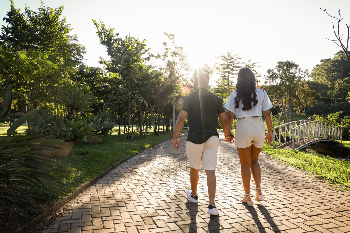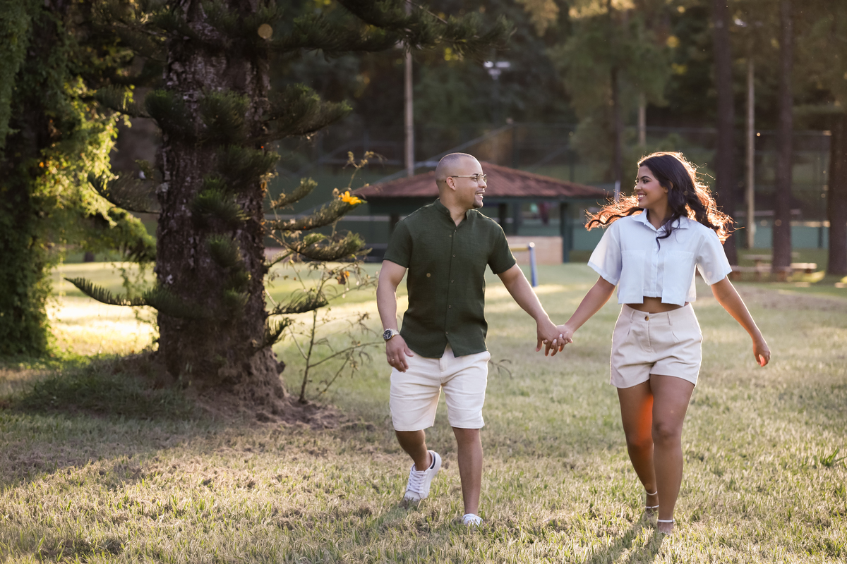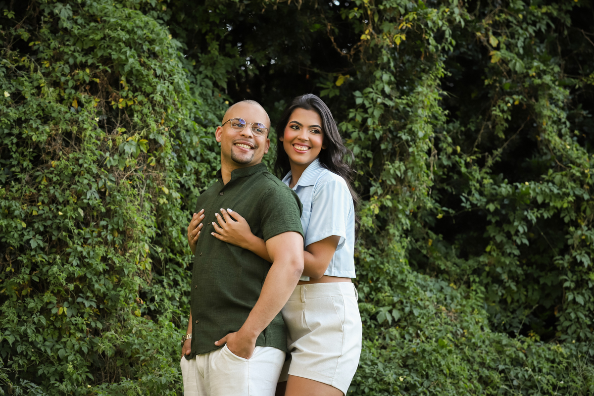 Passeamos pelos gramados verdinhos e nos perdemos sob as árvores espetaculares, que estavam floridas em um tom de amarelo vibrante, criando um cenário de conto de fadas. Cada clique era um registro da cumplicidade, dos sorrisos espontâneos e dos olhares que diziam "sim" muito antes do altar.