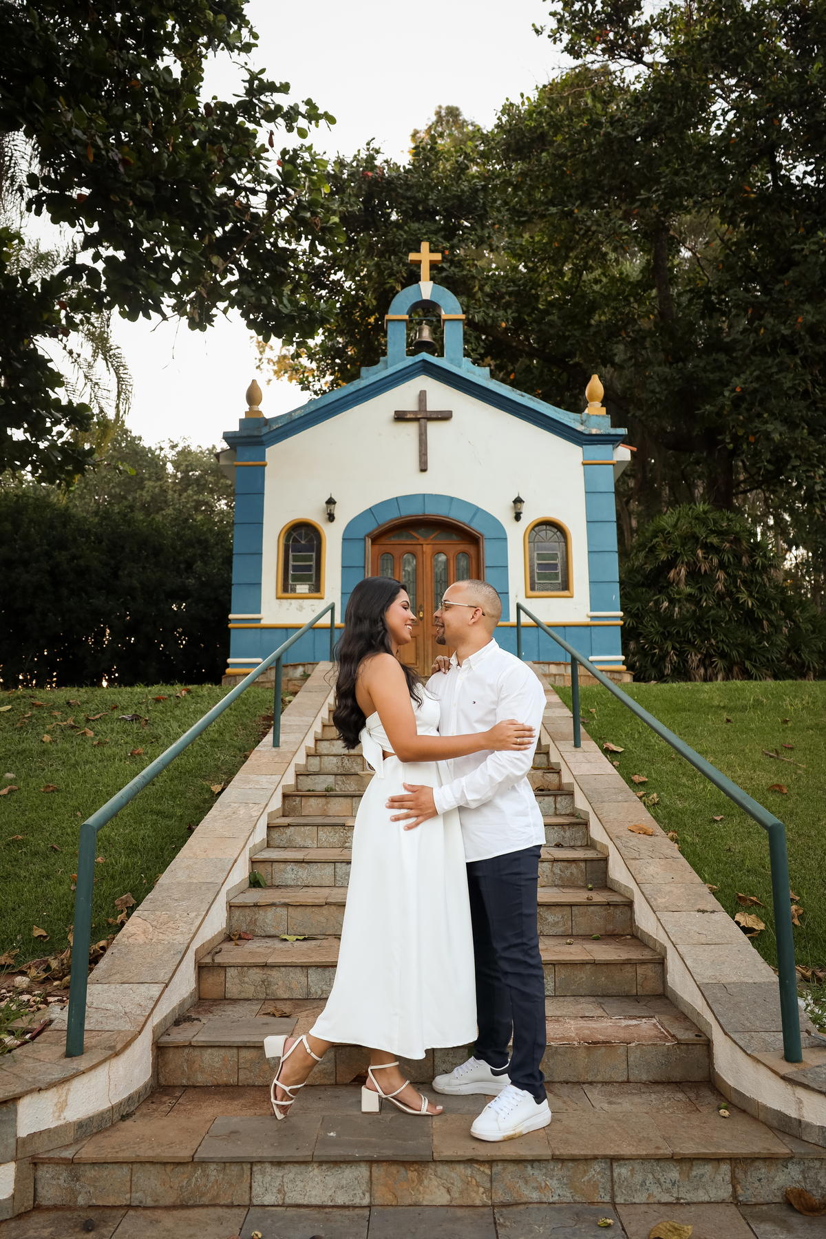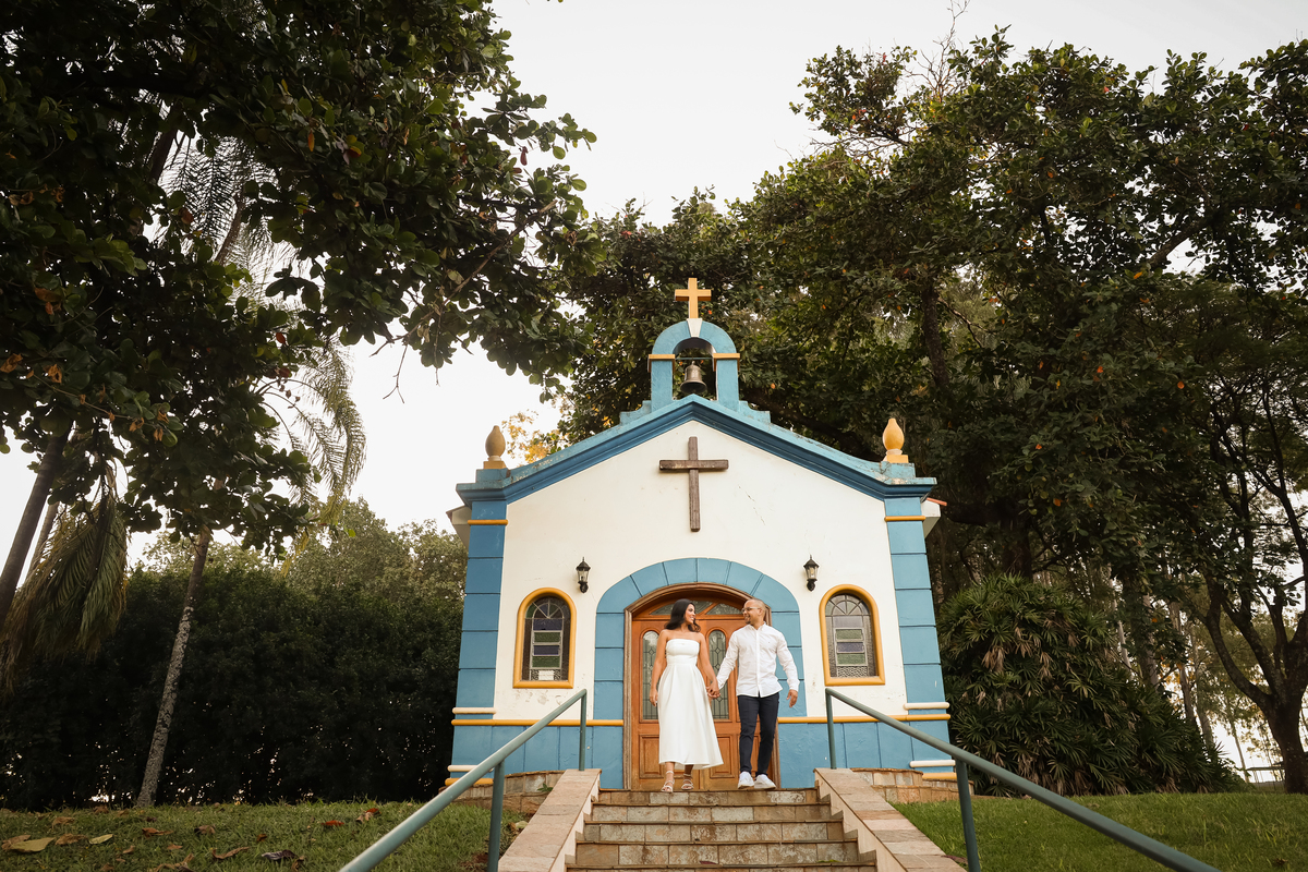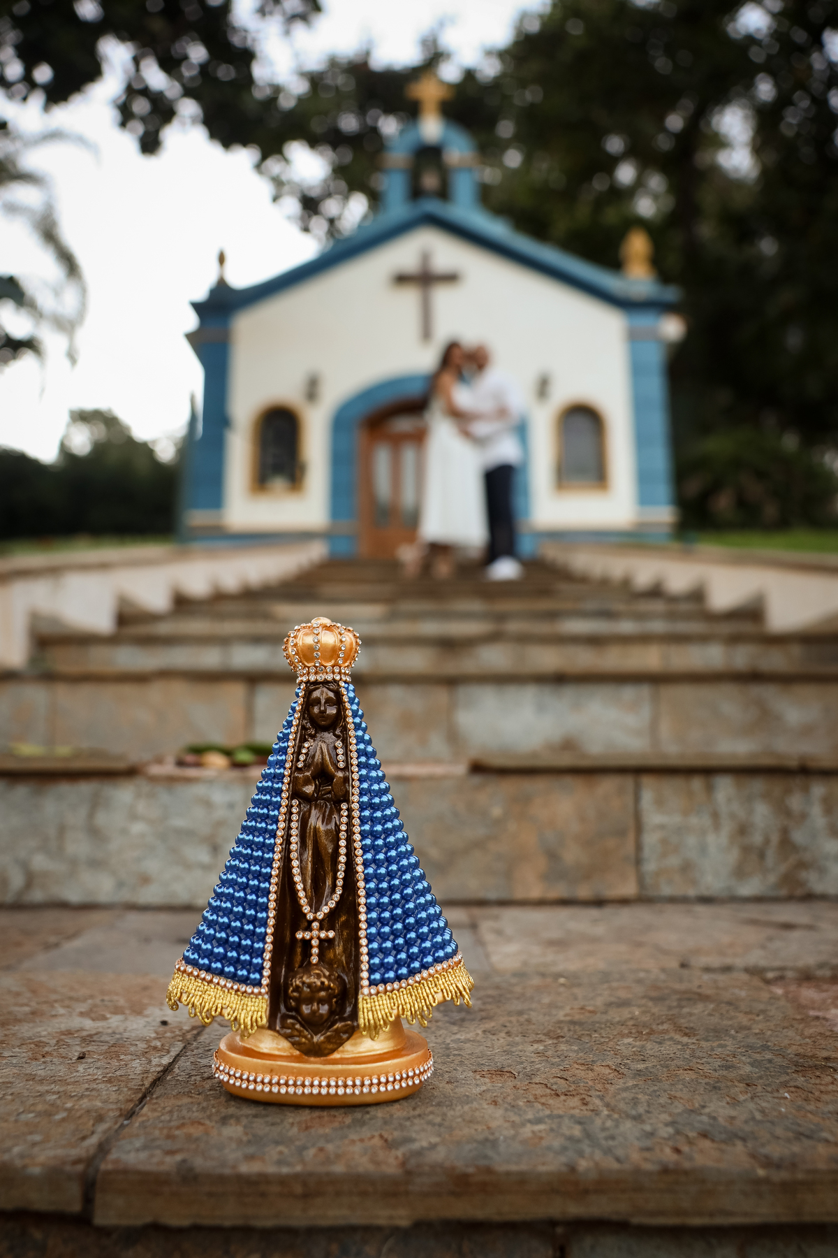 No entanto, foram os momentos mais pessoais que tornaram este ensaio pré-casamento verdadeiramente inesquecível. Na charmosa igrejinha do local, Maria Laura e Bruno nos mostraram a força que os une: a fé. Em um instante de pura emoção e devoção, eles seguraram juntos a imagem de Nossa Senhora Aparecida, um símbolo de proteção e bênção para a jornada que estão prestes a iniciar. Foi um momento de silêncio, respeito e profunda conexão espiritual.