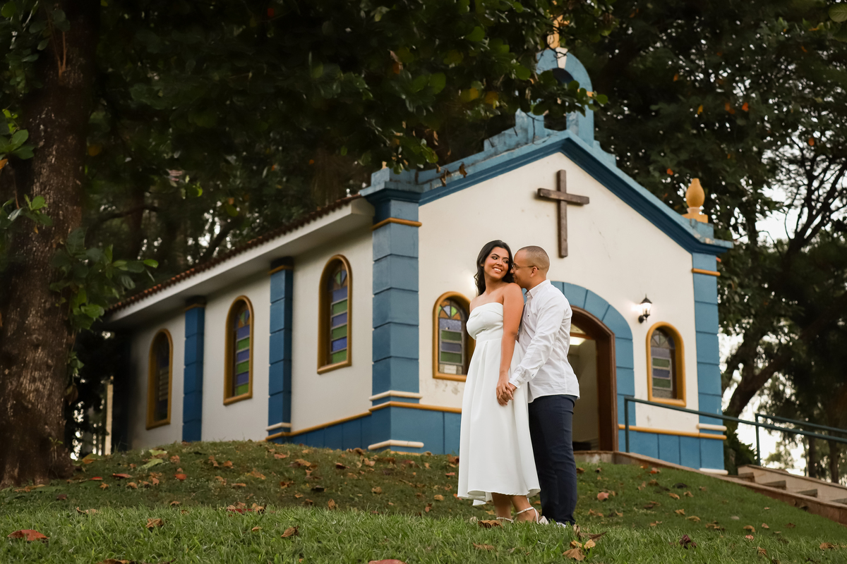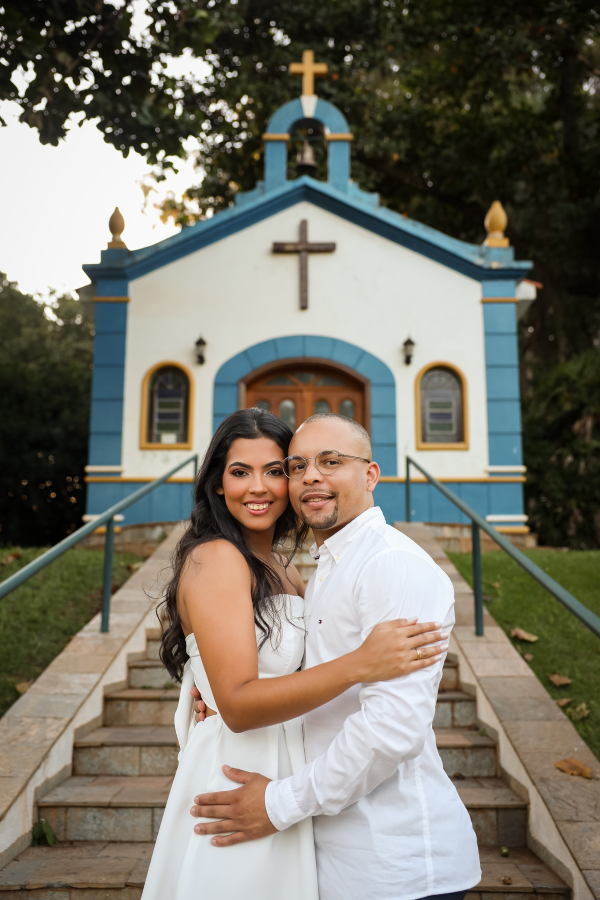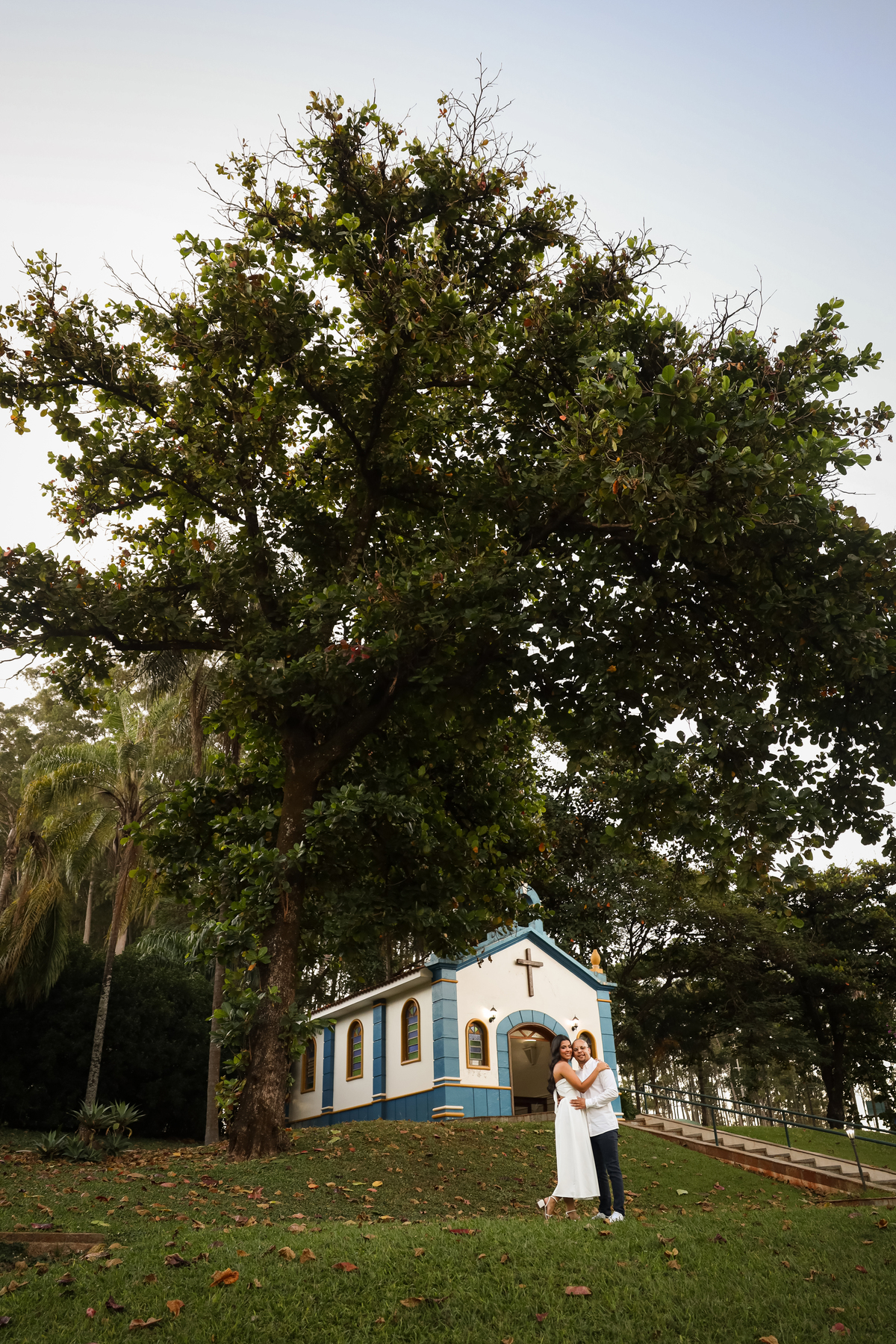 No entanto, foram os momentos mais pessoais que tornaram este ensaio pré-casamento verdadeiramente inesquecível. Na charmosa igrejinha do local, Maria Laura e Bruno nos mostraram a força que os une: a fé. Em um instante de pura emoção e devoção, eles seguraram juntos a imagem de Nossa Senhora Aparecida, um símbolo de proteção e bênção para a jornada que estão prestes a iniciar. Foi um momento de silêncio, respeito e profunda conexão espiritual.